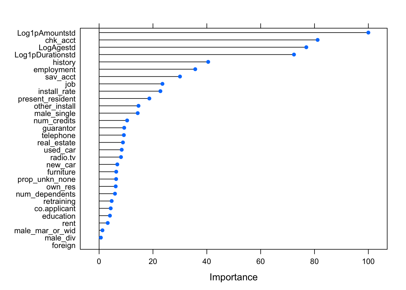 german <- german %>% select(-age, -amount, -obs, -duration, -LogAge, -Log1pAmount, -Log1pDuration)