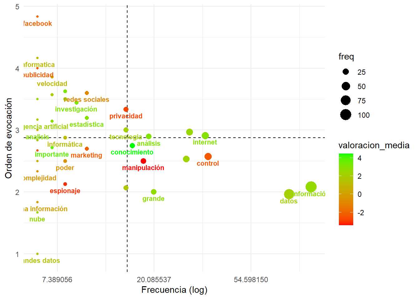 labs(y="Orden de evocación", x = "Frecuencia (log)") + # ponemos labels en los ejes