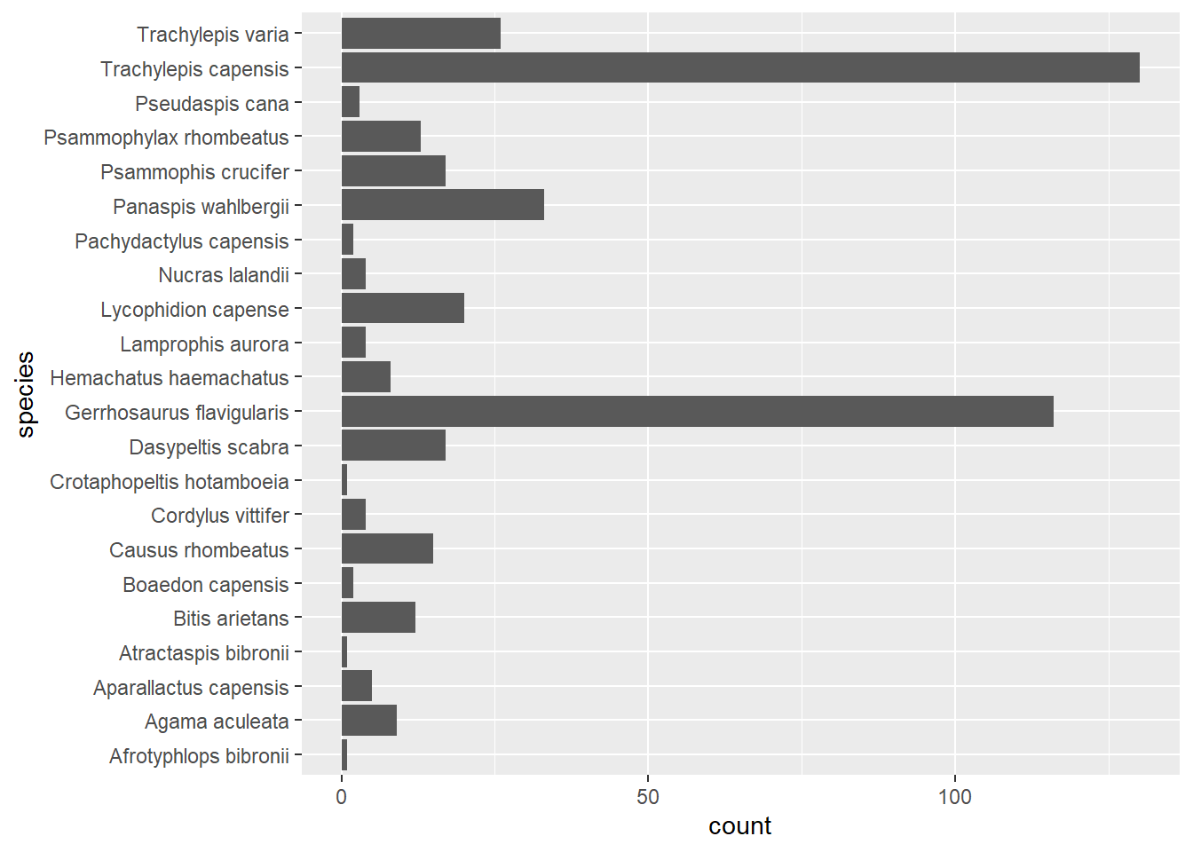 The code below is one way of creating an ordered plot of the most frequently captured reptile species during the survey. It makes use of the forcats package from the Tidyverse.