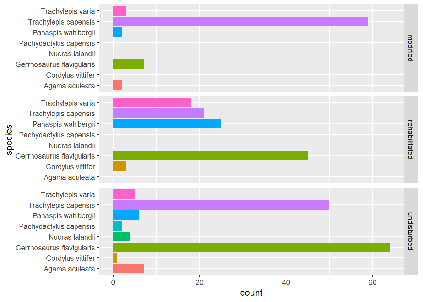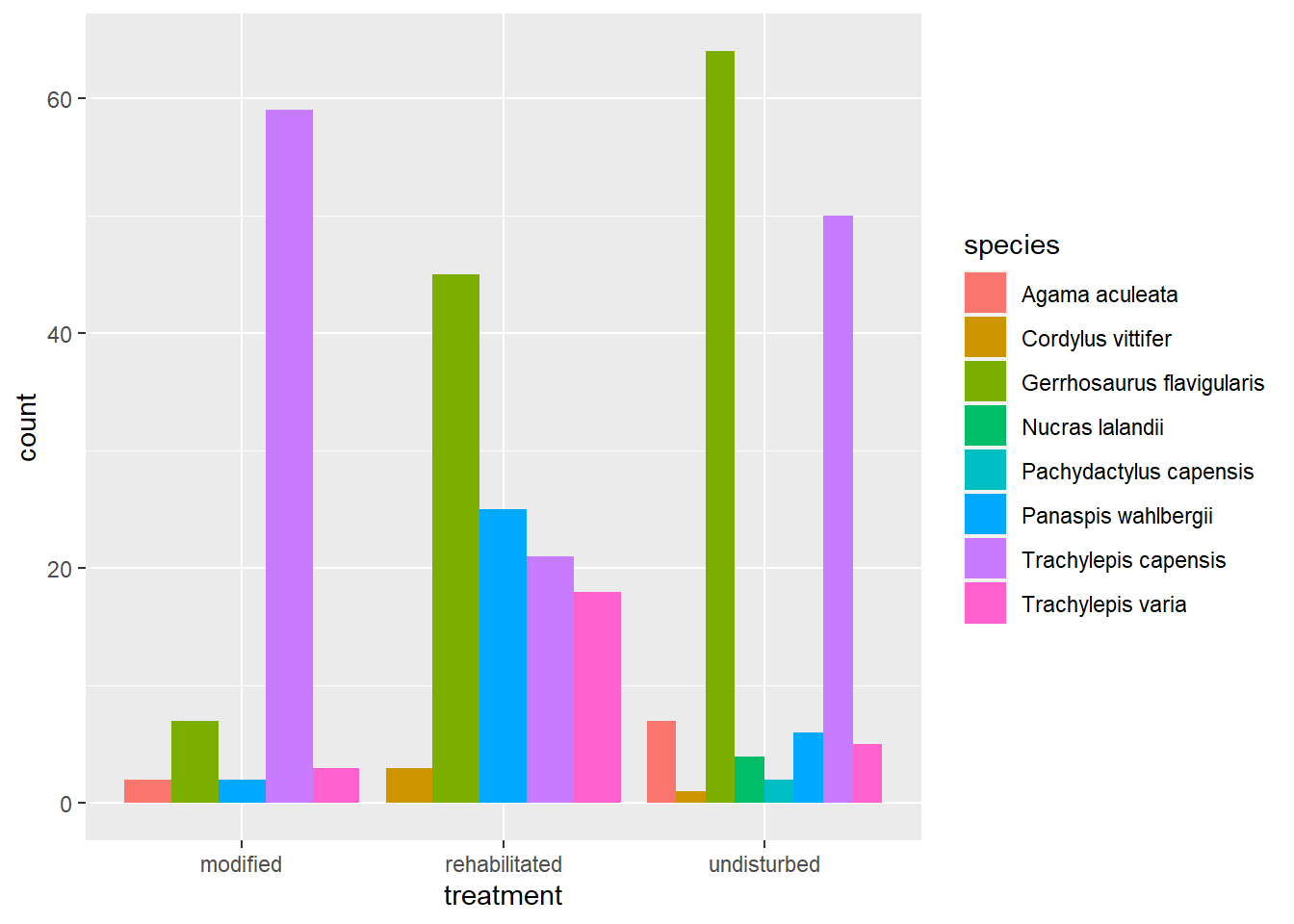 The first plot maps treatment to the x-axis and then counts all captures per lizard species and fills each bar with a unique colour per species. The other way to plot this same information is to use a facet_* function such as in the code below: