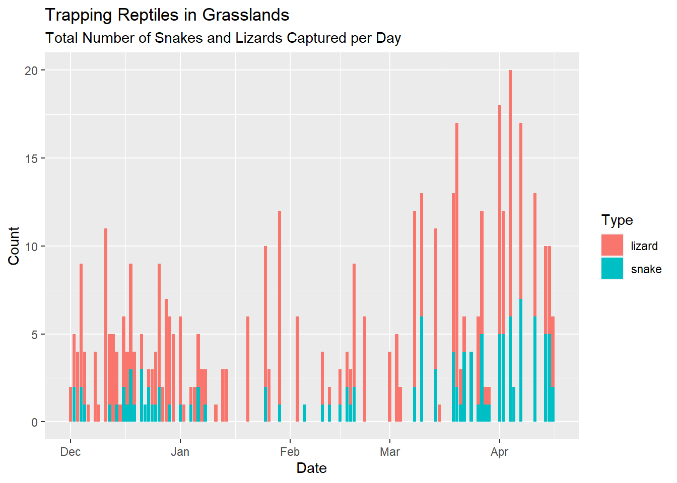 subtitle = "Total Number of Snakes and Lizards Captured per Day",