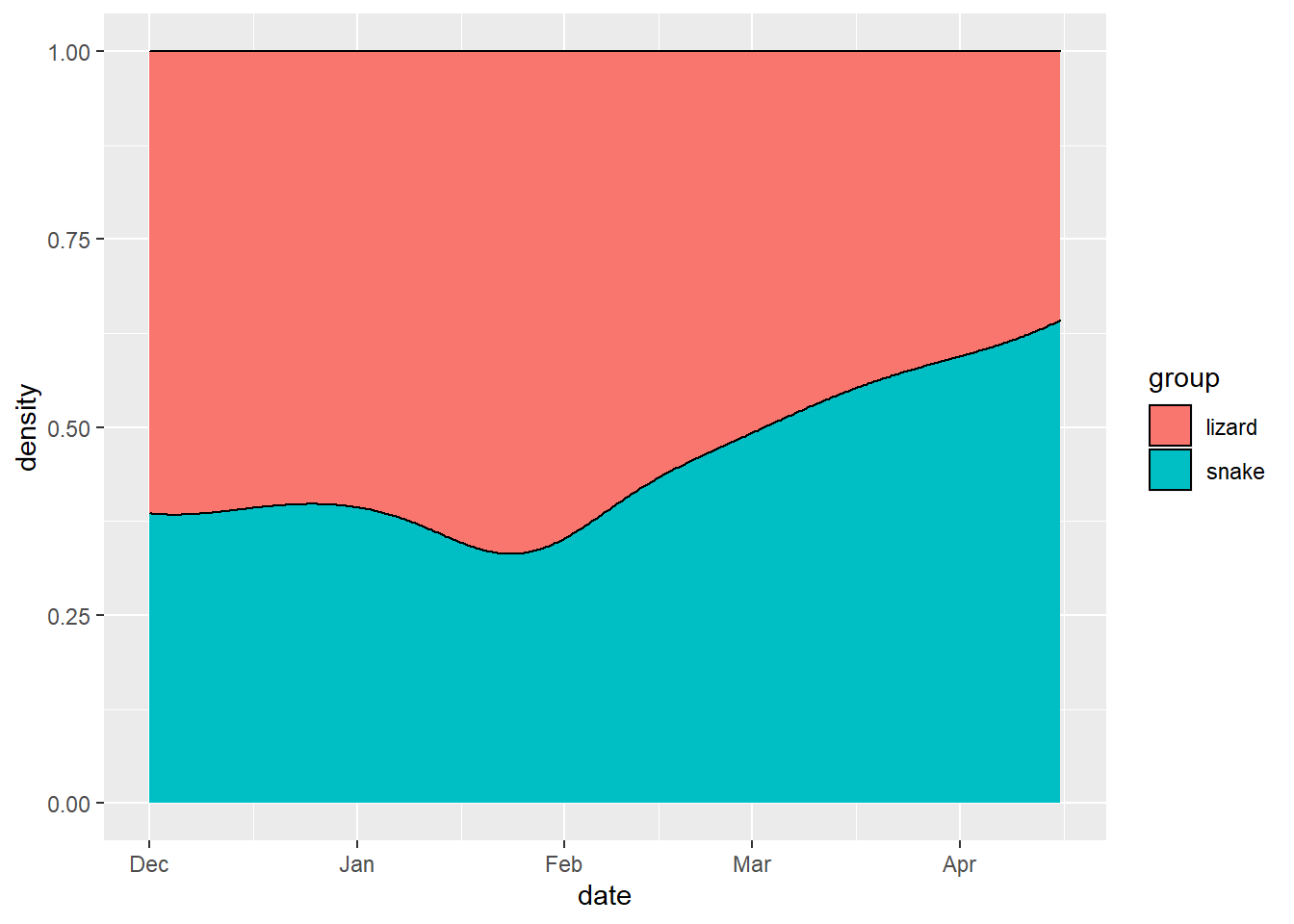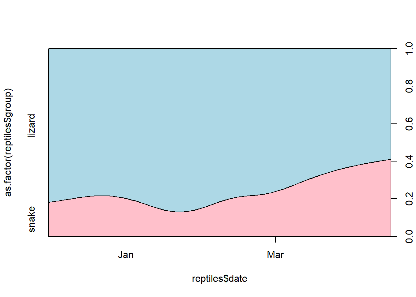 cdplot(x = reptiles$date, y = as.factor(reptiles$group), col = c("pink", "light blue"))