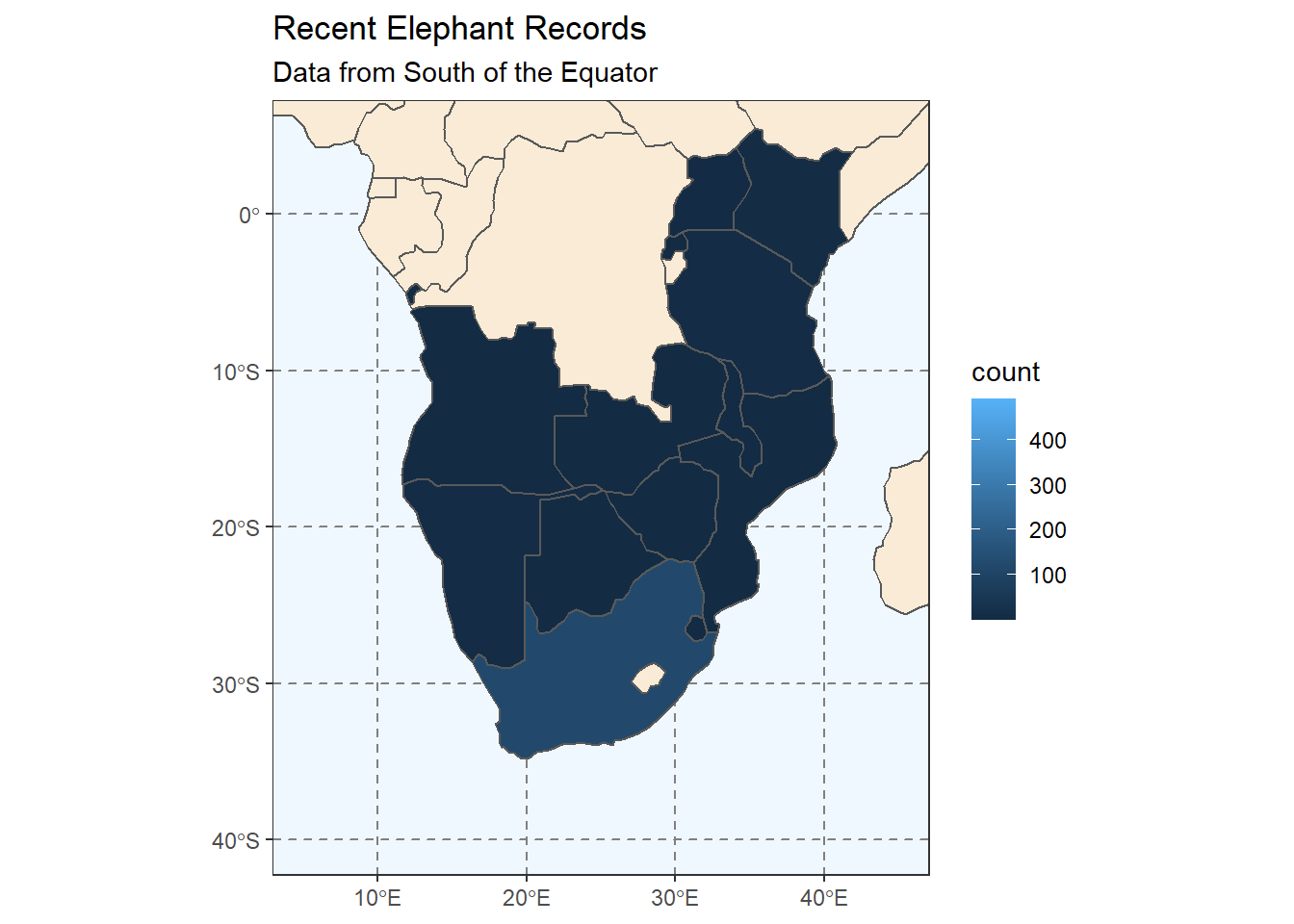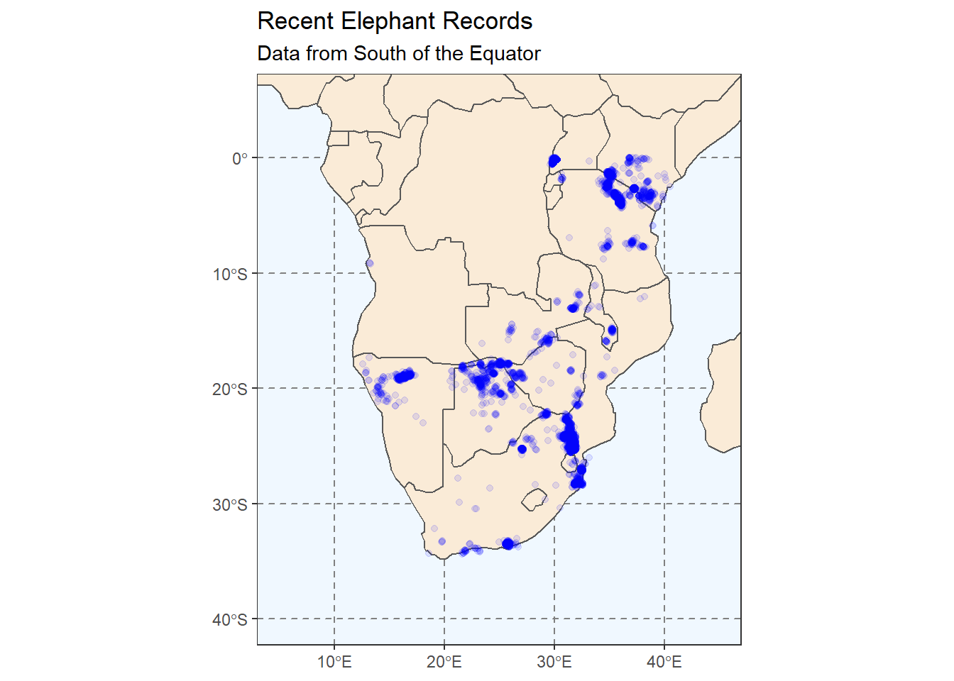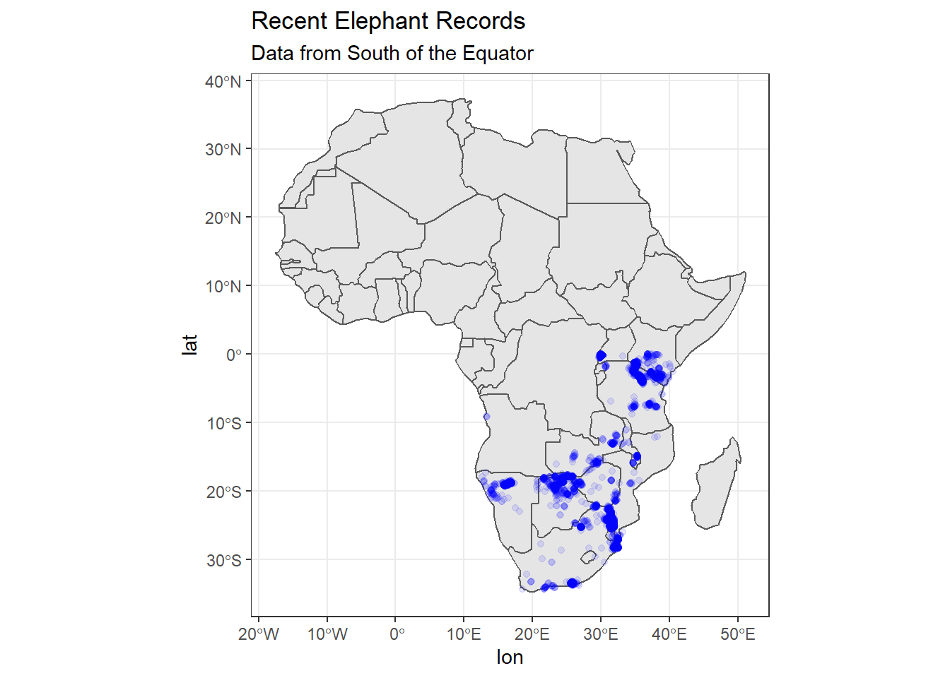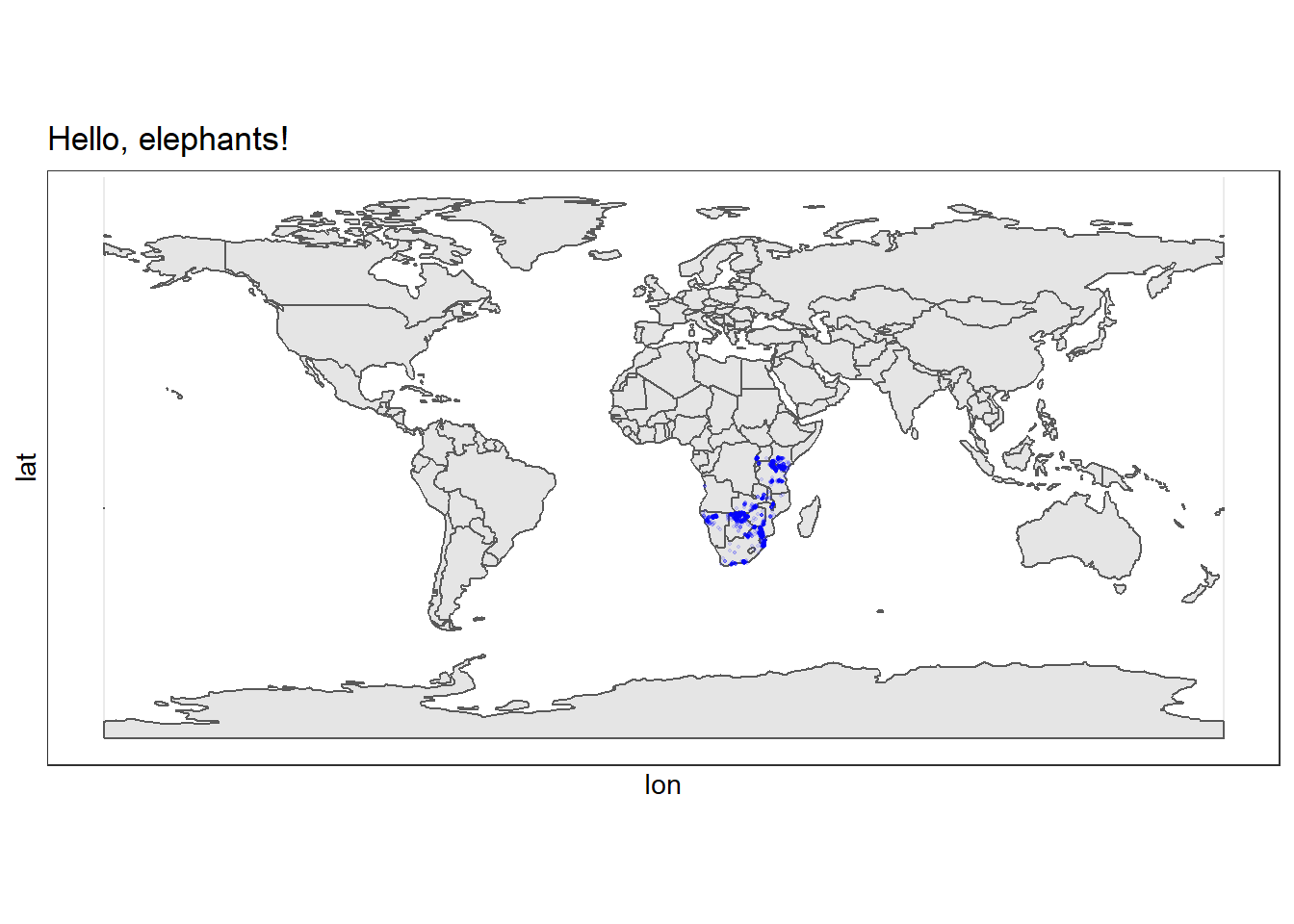 That’s a great start! Now let’s add our elephant data to this map. We will use the familiar geom_point function.