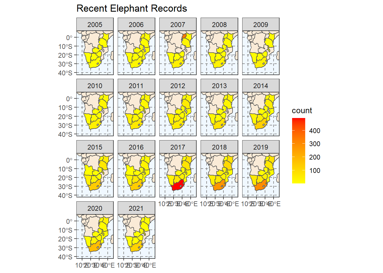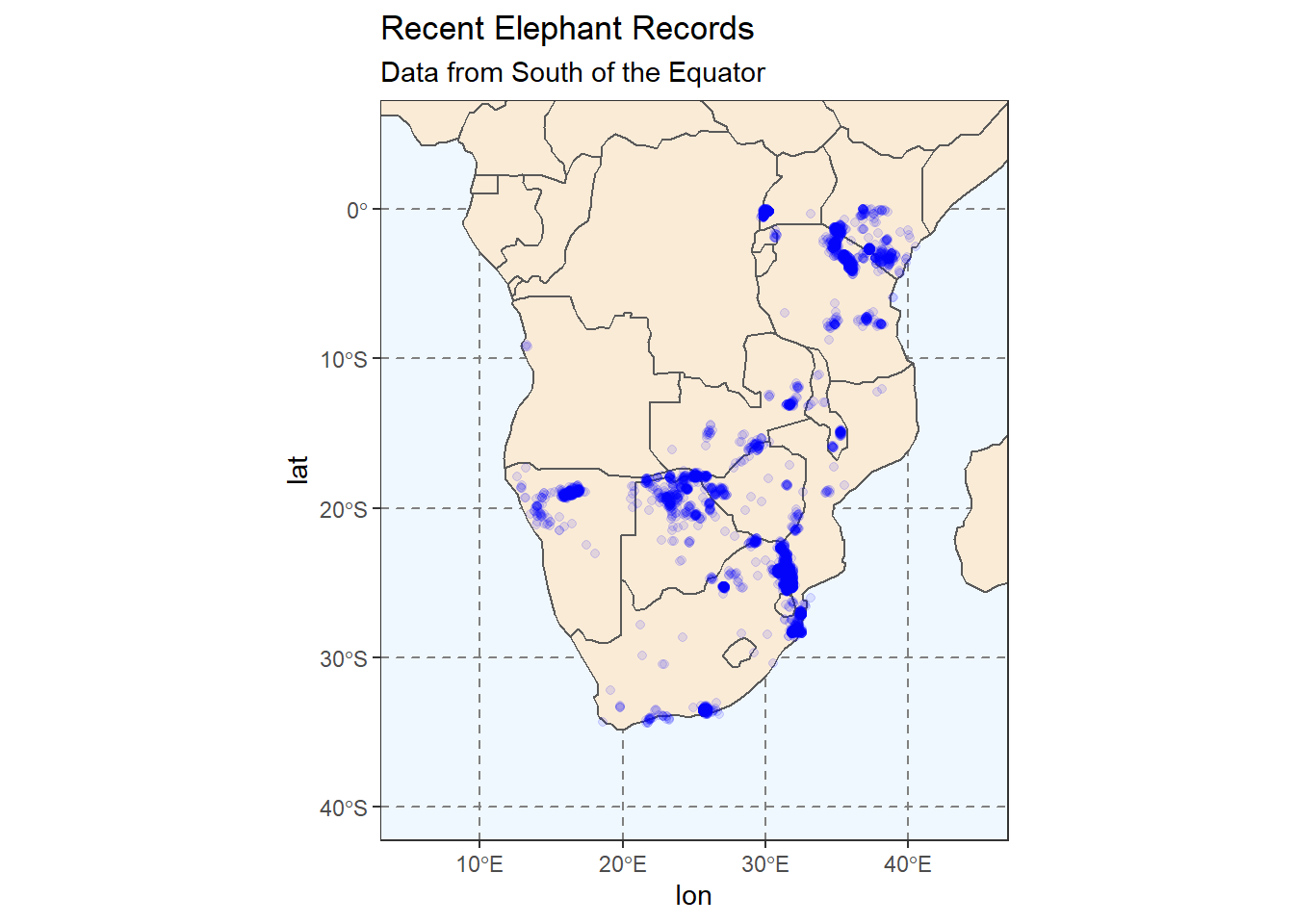 Data can be downloaded in various ways, including from inside an R workspace. I used the rgbif package to request the 5000 most-recent, south of the Equator, records of the African Elephant (Loxodonta africana) found in the GBIF database (exported on 14 July 2021). We won’t all be doing this because it involves downloading from the GBIF server, and it supplies the data in a format that is cluttered with database information that we don’t need. I tidied the GBIF data, and exported it to elephants.csv for use in the class today.