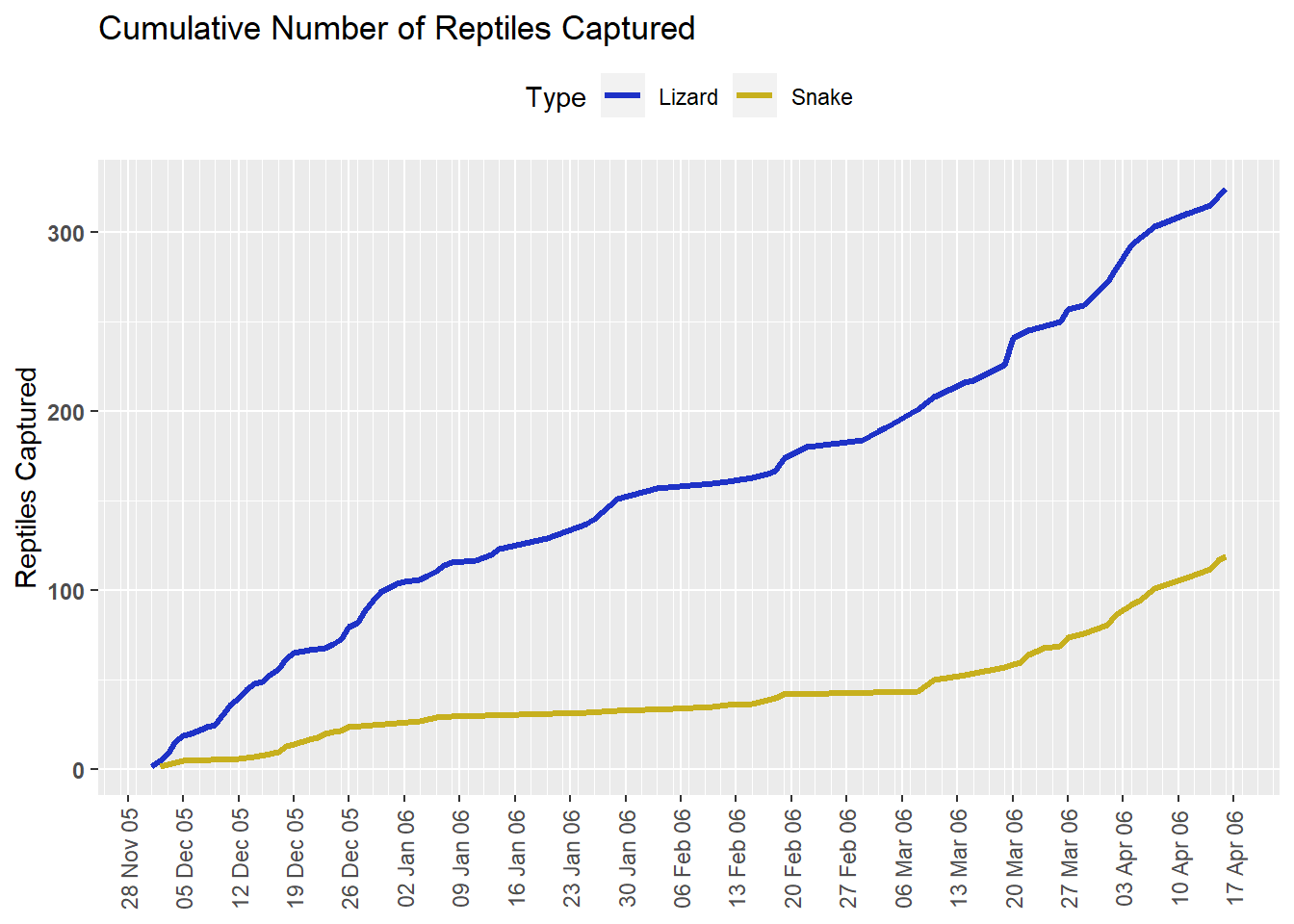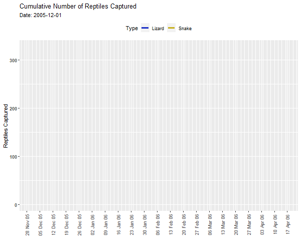 In the first animation, we will look at our reptiles data in an entirely new way. We are going to look at the cumulative numbers of lizards and snakes caught throughout the survey, and highlight the increase in the numbers of captures (evident in the increased slope of the line) in the month before we stopped surveying.