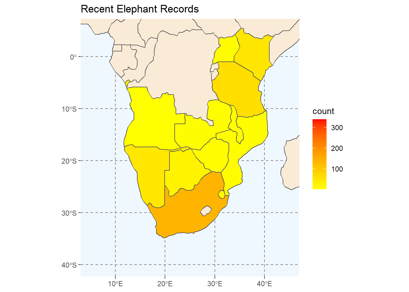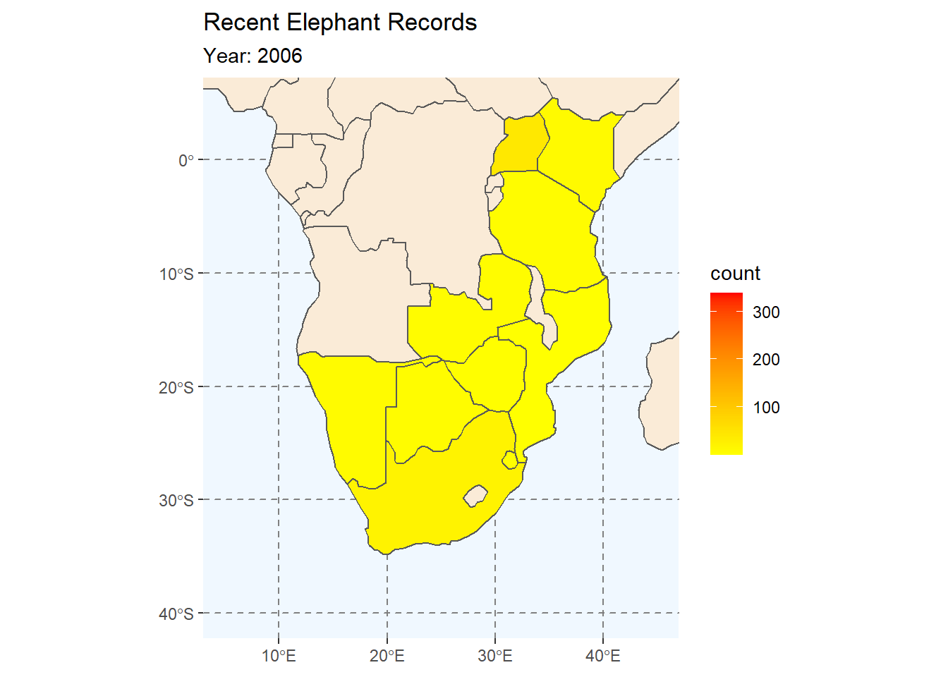In this sescond animation we will be animating our choropleth map of Elephant counts from our earlier session. The plot is exactly like the one we made before, but without the facet-wrap function applied. Instead we will animate the map by year.