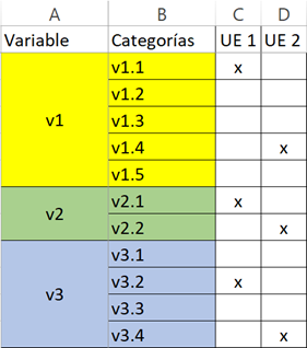 Hoja 1. La columna A contiene los nombres (o cualquier otra etiqueta) de las variables. Para facilitar la visualización, bien pueden combinarse todas las celdas de las filas correspondientes a las diferentes categorías de la variable, aunque ello no es obligatorio; también podría ponerse el nombre de la variable en la fila correspondiente a la primera categoría. En la columna B aparecen los nombres (o cualquier otra etiqueta) de las diferentes categorías de cada variable. En las columna C y sucesivas se registra, mediante cualquier marca, el estado de la variable en la unidad evaluada (una columna por unidad de evaluación). Así, por ejemplo, en la primera unidad de evaluación (UE 1, columna C), la variable v1 exhibió el estado v1.1; la v2, el estado v2.1, mientras que el estado de v3 fue v3.2.