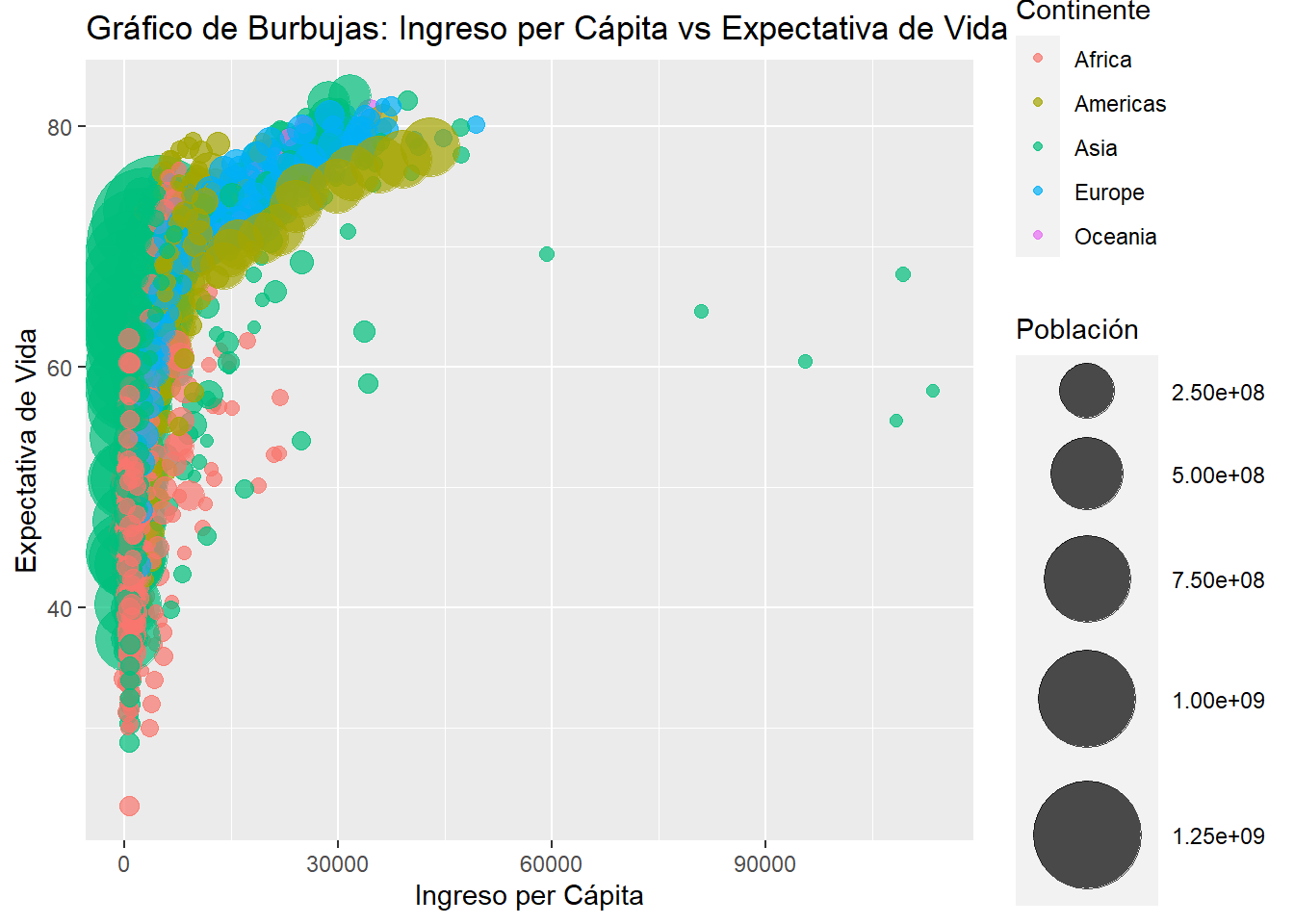 labs(title = "Gráfico de Burbujas: Ingreso per Cápita vs Expectativa de Vida",