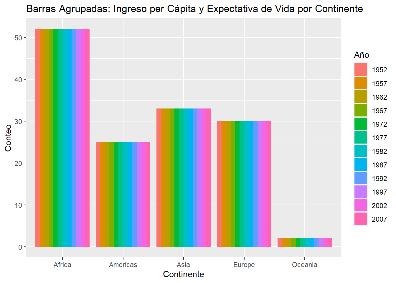 labs(title = "Barras Agrupadas: Ingreso per Cápita y Expectativa de Vida por Continente",