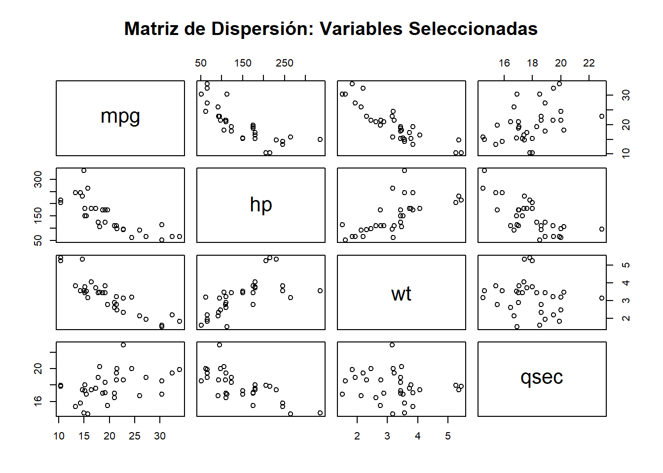 pairs(mtcars[, c("mpg", "hp", "wt", "qsec")], main = "Matriz de Dispersión: Variables Seleccionadas")