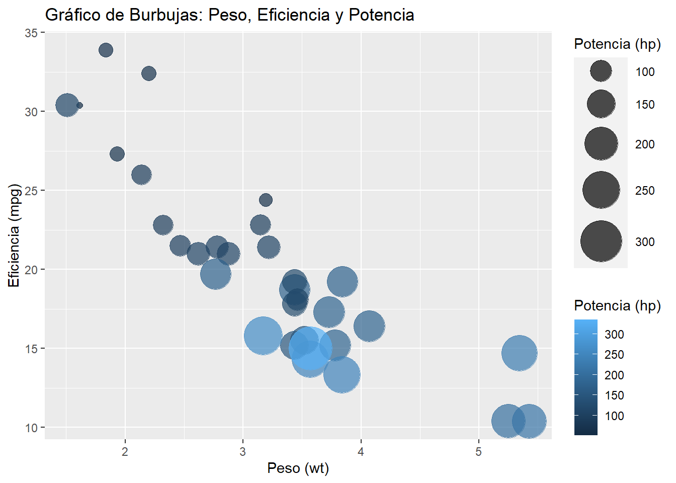 labs(title = "Gráfico de Burbujas: Peso, Eficiencia y Potencia",