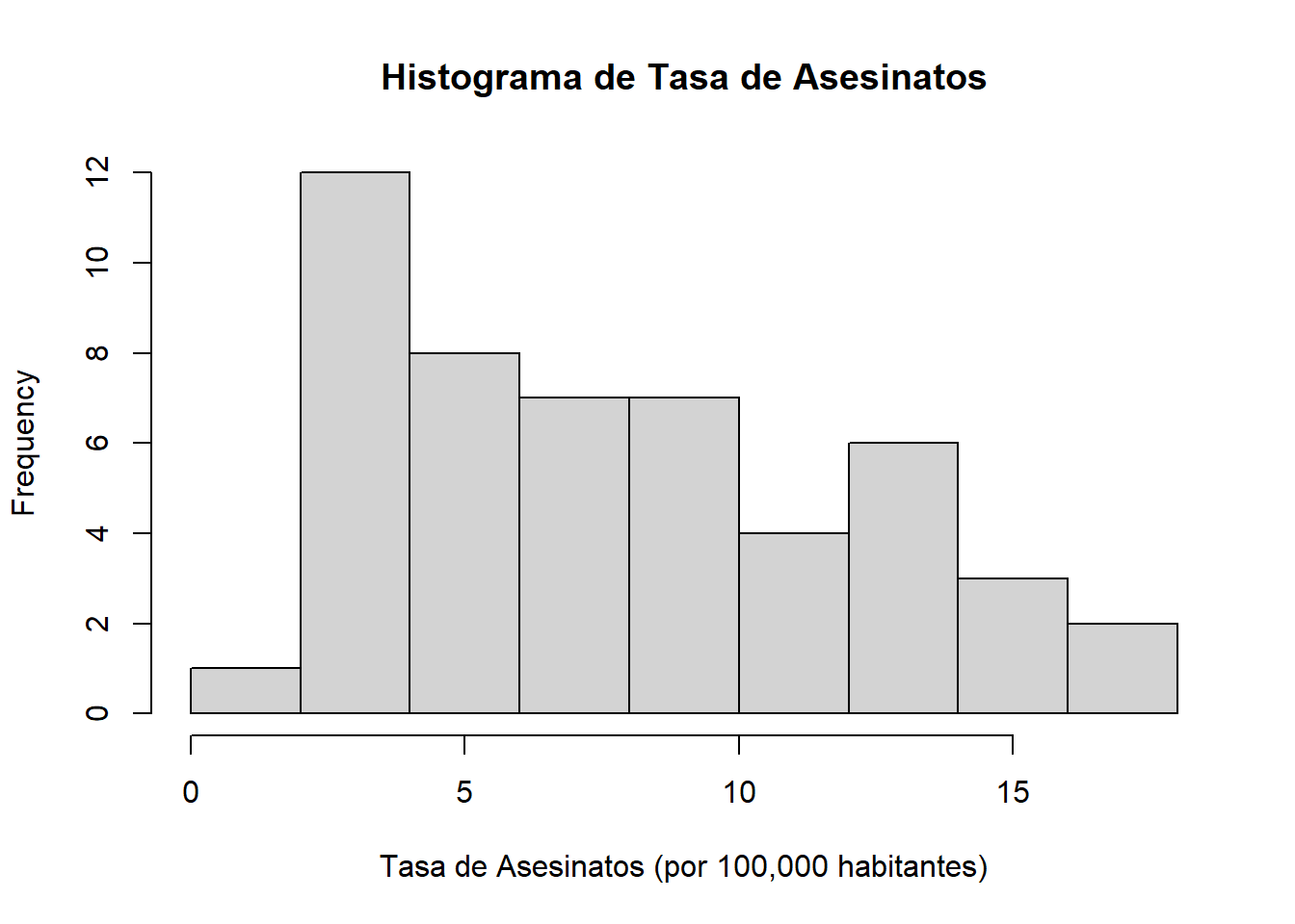 Interpretación: El histograma muestra la distribución de la tasa de asesinatos en los arrestos en Estados Unidos. Cada barra del histograma representa un intervalo de valores de tasas de asesinatos, y la altura de la barra indica la frecuencia de observaciones en ese intervalo. Este tipo de gráfico es útil para visualizar la forma general de la distribución y para identificar patrones en la concentración de los datos, como la presencia de sesgos, modas o la dispersión de los valores.