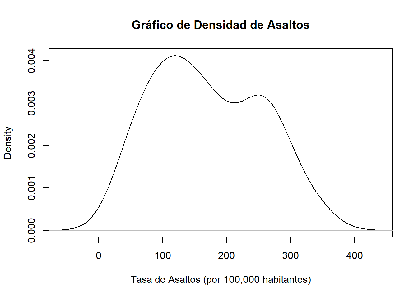 El código tiene como propósito crear un Gráfico de Densidad para la variable Assault (tasa de asaltos) en el conjunto de datos USArrests. Un Gráfico de Densidad proporciona una estimación visual de la distribución de probabilidad de la variable, permitiendo identificar la forma y concentración de los valores.