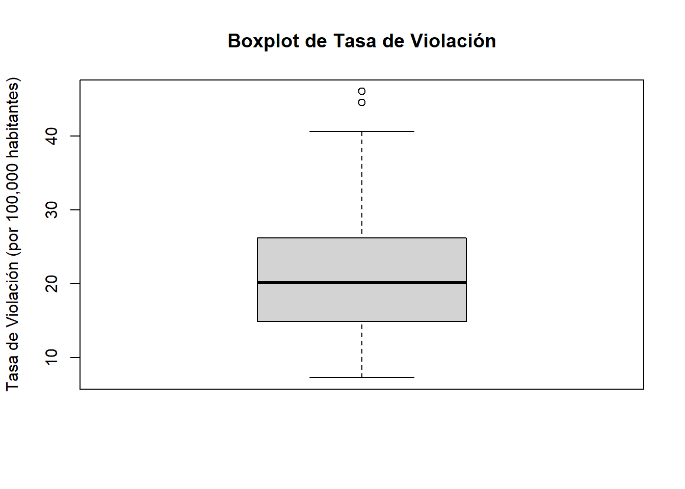 boxplot(USArrests$Rape, main = "Boxplot de Tasa de Violación", ylab = "Tasa de Violación (por 100,000 habitantes)")
