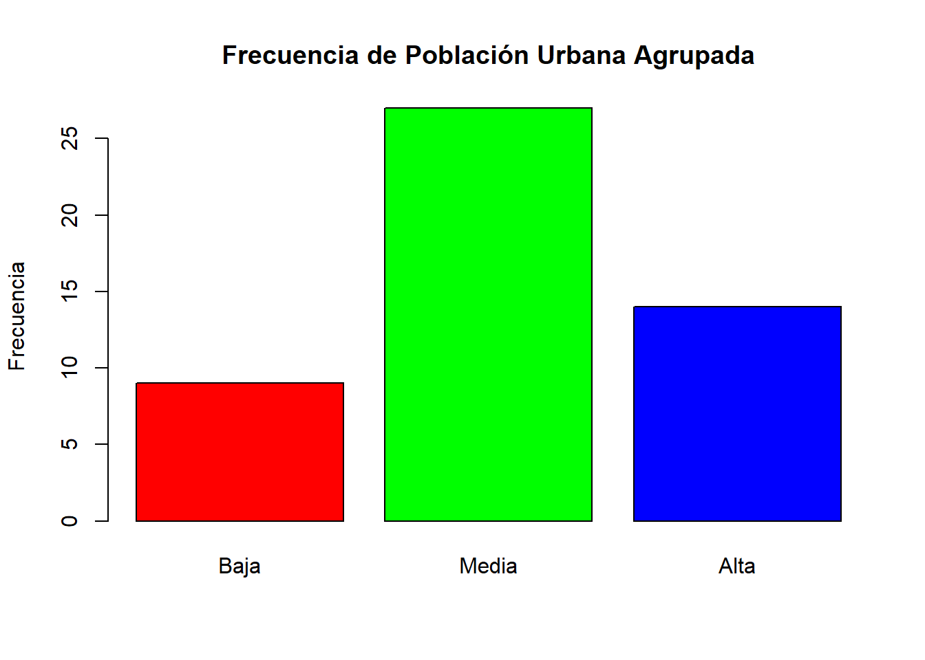 Interpretación: El gráfico de barras muestra la frecuencia de la población urbana en las categorías “Baja”, “Media” y “Alta”. Cada barra representa una categoría y su altura indica la frecuencia (número de observaciones) en esa categoría. Los colores de las barras proporcionan una distinción visual entre las categorías, permitiendo una rápida comparación de la frecuencia relativa de la población en diferentes niveles de urbanización.