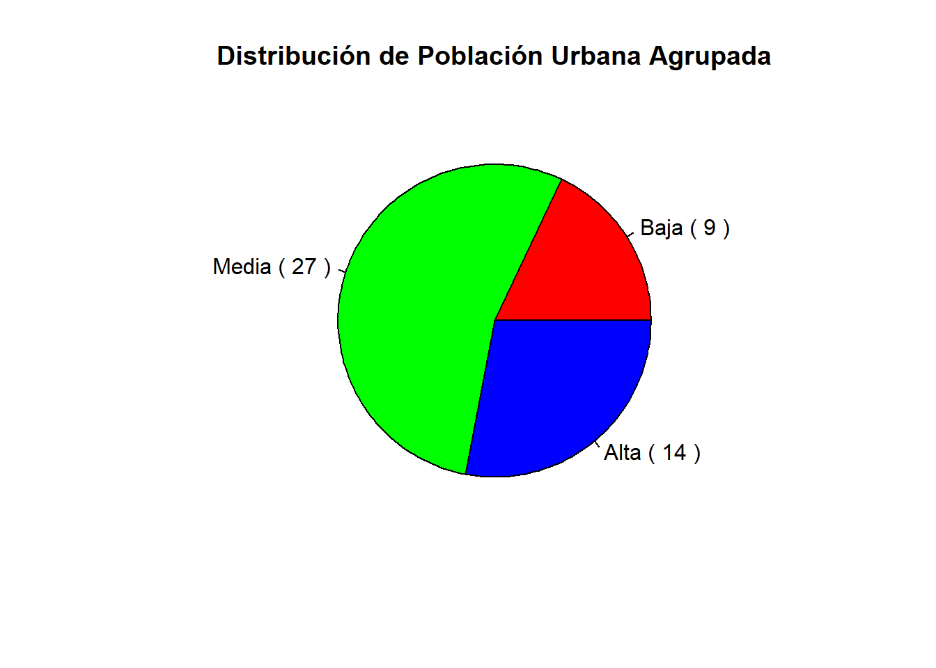 El gráfico de pastel resultante mostrará la proporción de la población urbana clasificada en las categorías “Baja”, “Media” y “Alta”. Cada sector del pastel representará una categoría, y el color y las etiquetas proporcionarán información visual sobre la distribución de la población urbana en esas categorías.
