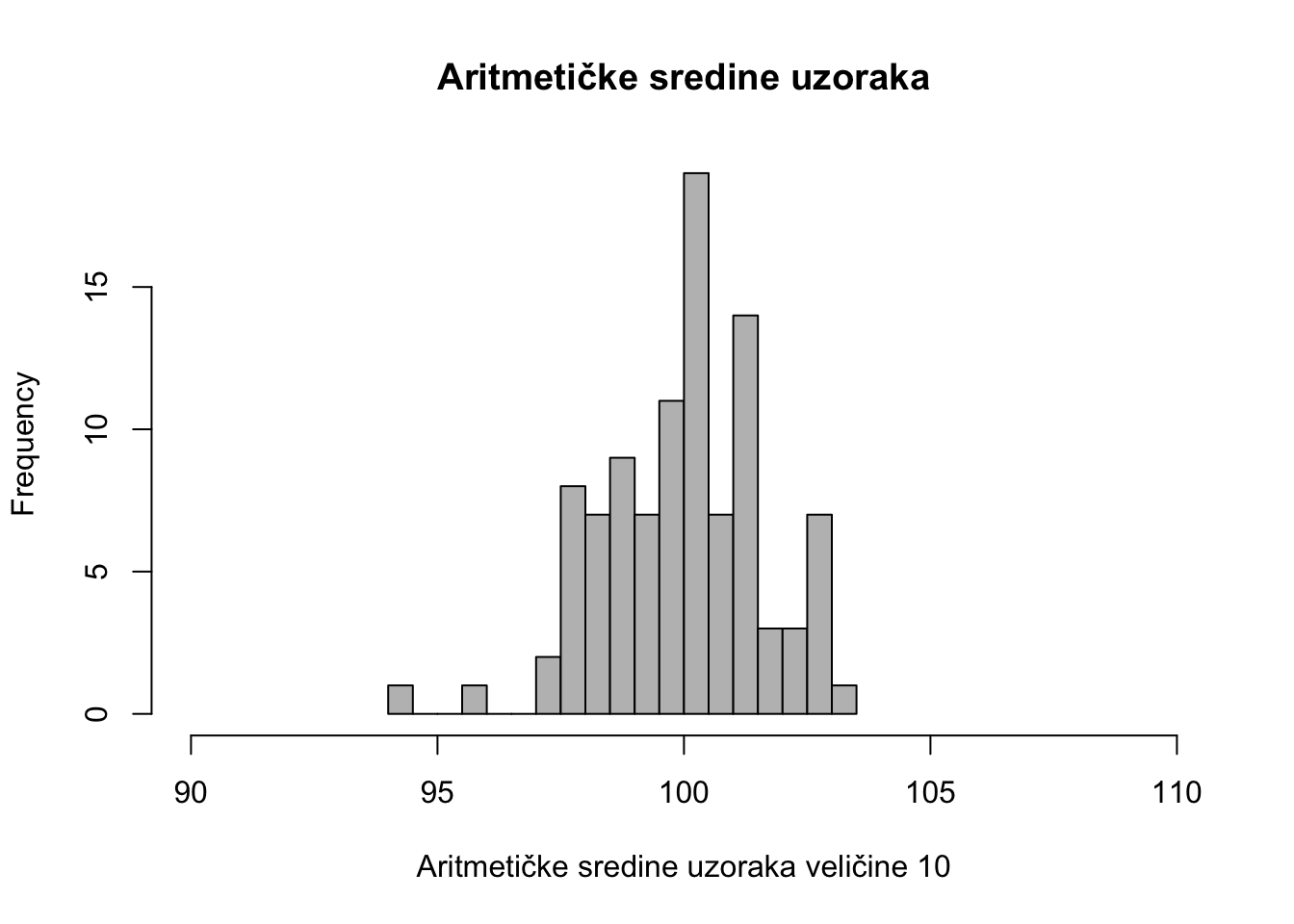 hist(xbar, nclass = 20, col = "grey", xlab = "Aritmetičke sredine uzoraka veličine 10", main = "Aritmetičke sredine uzoraka", xlim = c(90, 110))