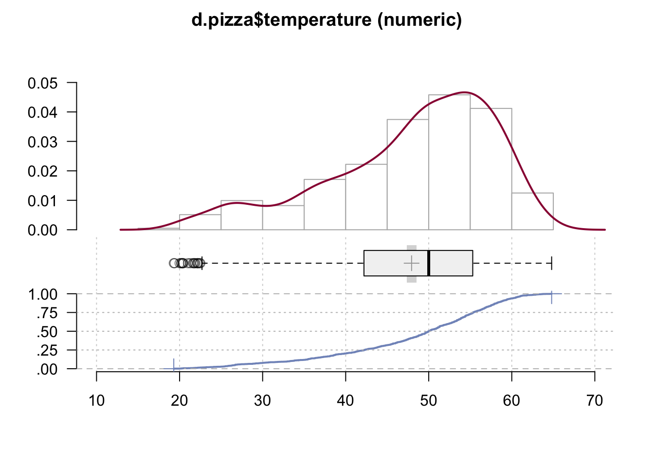 Osim pomoću paketa psych, opisna statistika i izgled raspodjele lijepo se može prikazati pomoću drugih paketa lessR ili DescTools (Signorell, 2021).