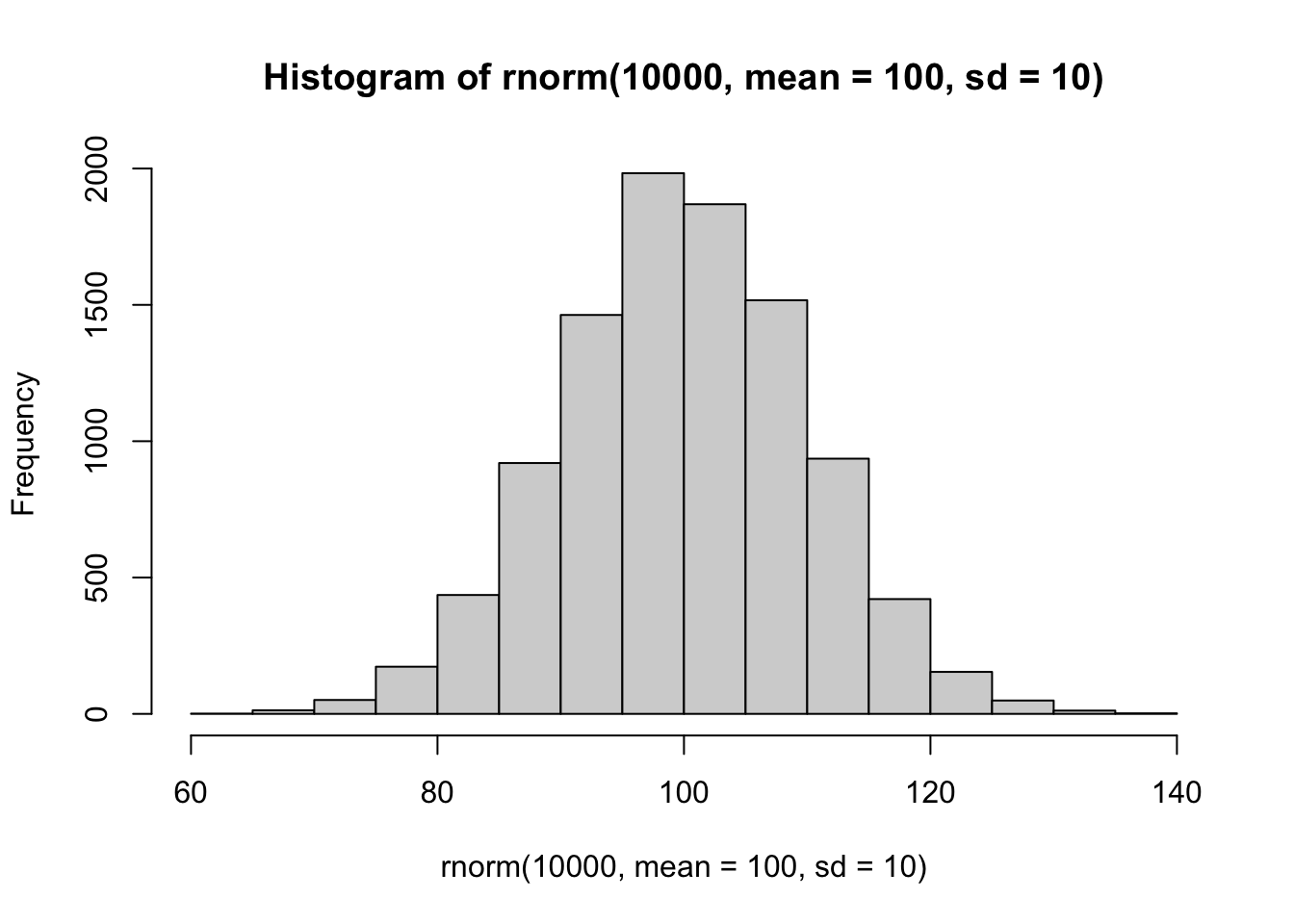 Tako funkcija pnorm omogućava izračun površine i vjerojatnosti iznad određene vrijednosti normalne raspodjele. Ako zamislimo normalnu raspodjelu koeficijenata inteligencije (IQ) čija je aritmetička sredina 100 i devijacija 10, koliko je vjerojatno u slučajnom odabiru dobiti vrijednost veću od 110.