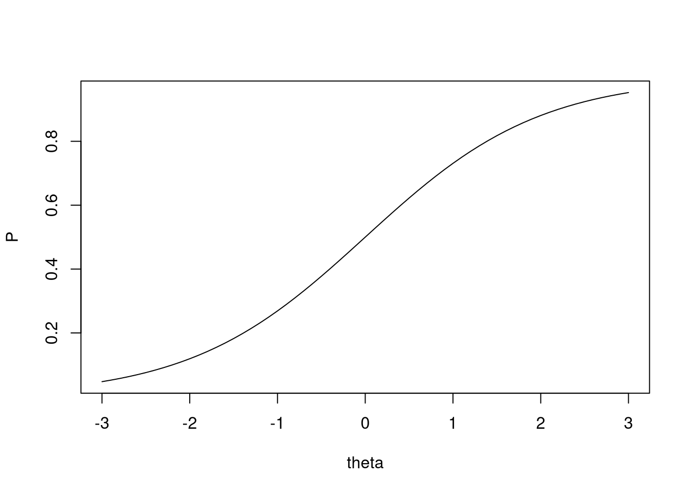 P <- 1 / (1 + exp(-amoderate * (theta - bmedium)))