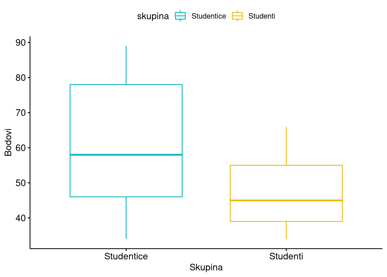 #Primjer: usporedba broja bodova koji su postigli studenti i studentice