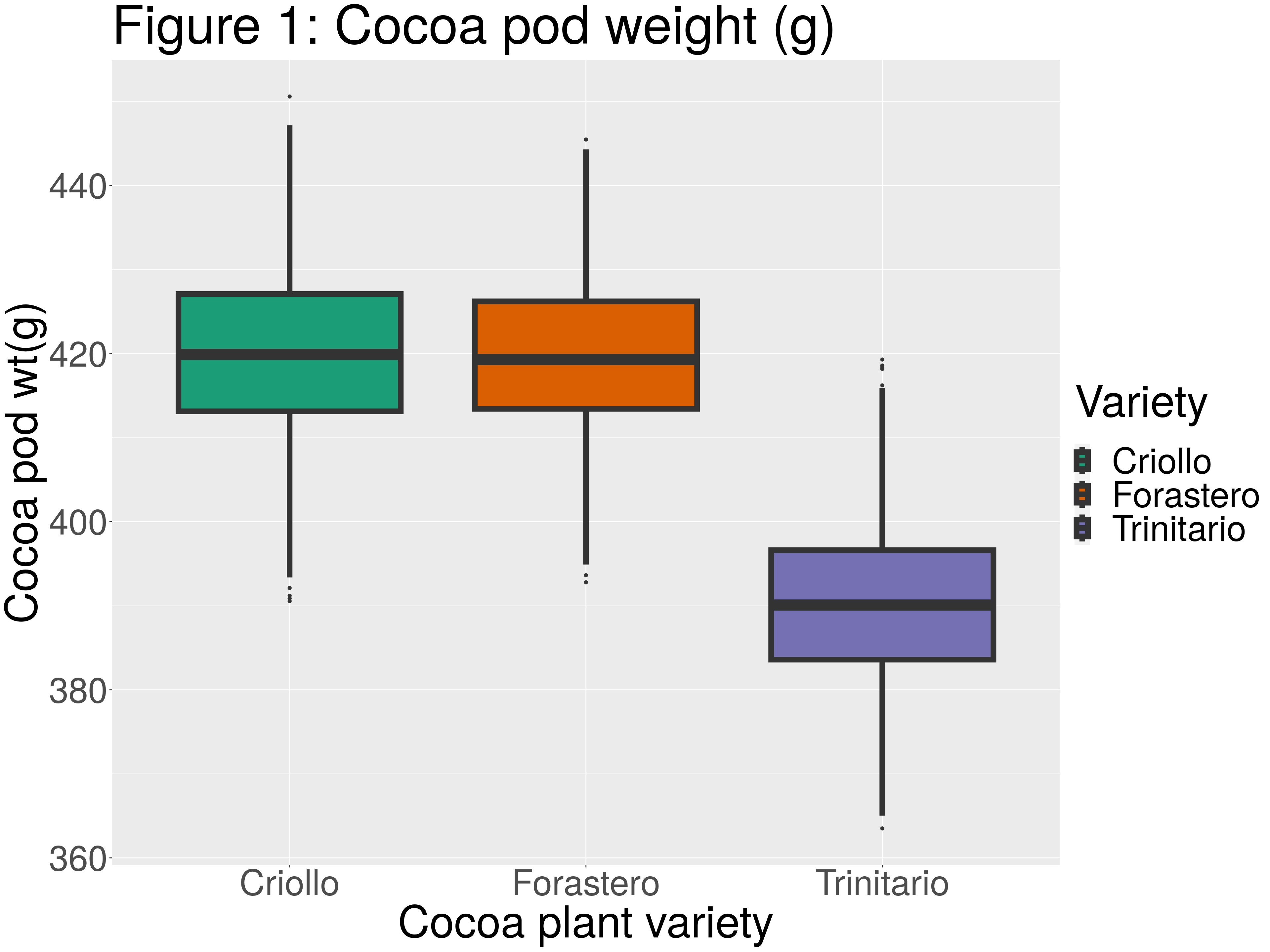 ylab("Cocoa pod wt(g)")+ggtitle("Figure 1: Cocoa pod weight (g)")