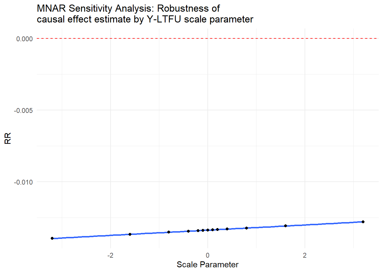 For scenario 3 (MNAR mechanism dependent on \(Y\)), we suggest that the following table, figure and interpretations can be used to more effectively communicate findings from the sensitivity analysis. These can be included in the main results of the manuscript or an attached supplement. Sample output is included below (more examples can be found in Section 5)