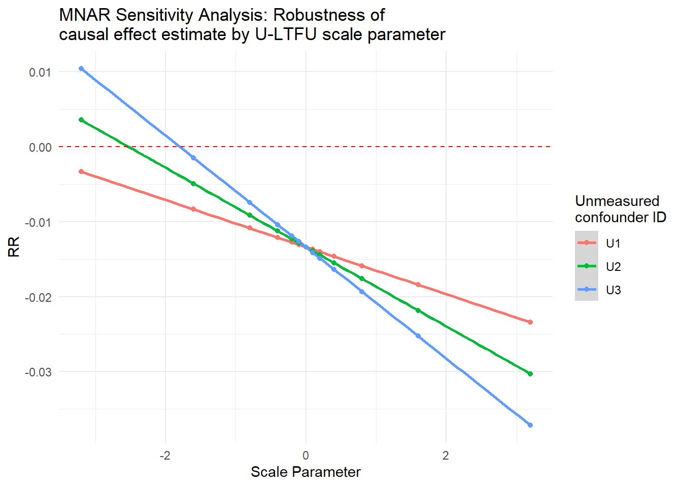 For MNAR scenarios in which LTFU is dependent on an unmeasured confounder \(U\), we suggest a parallel set of tables and figures that can be used to more effectively communicate findings from the sensitivity analysis. We further recommend reporting the magnitude of association between the generated “unmeasured” U, exposure, and disease, as follows, as shown at the end of this section.