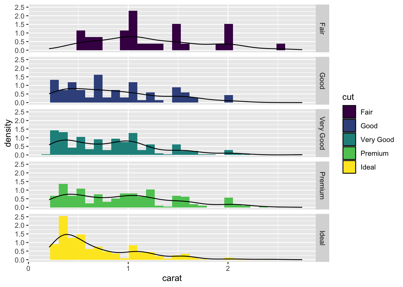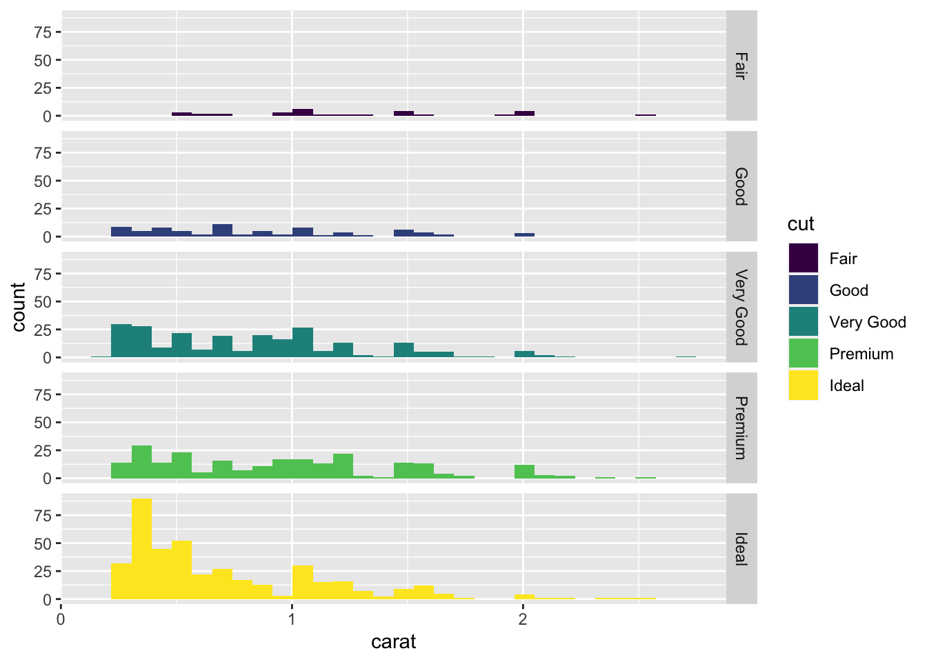 facet_grid(cut ~ .)## `stat_bin()` using `bins = 30`. Pick better value with `binwidth`.