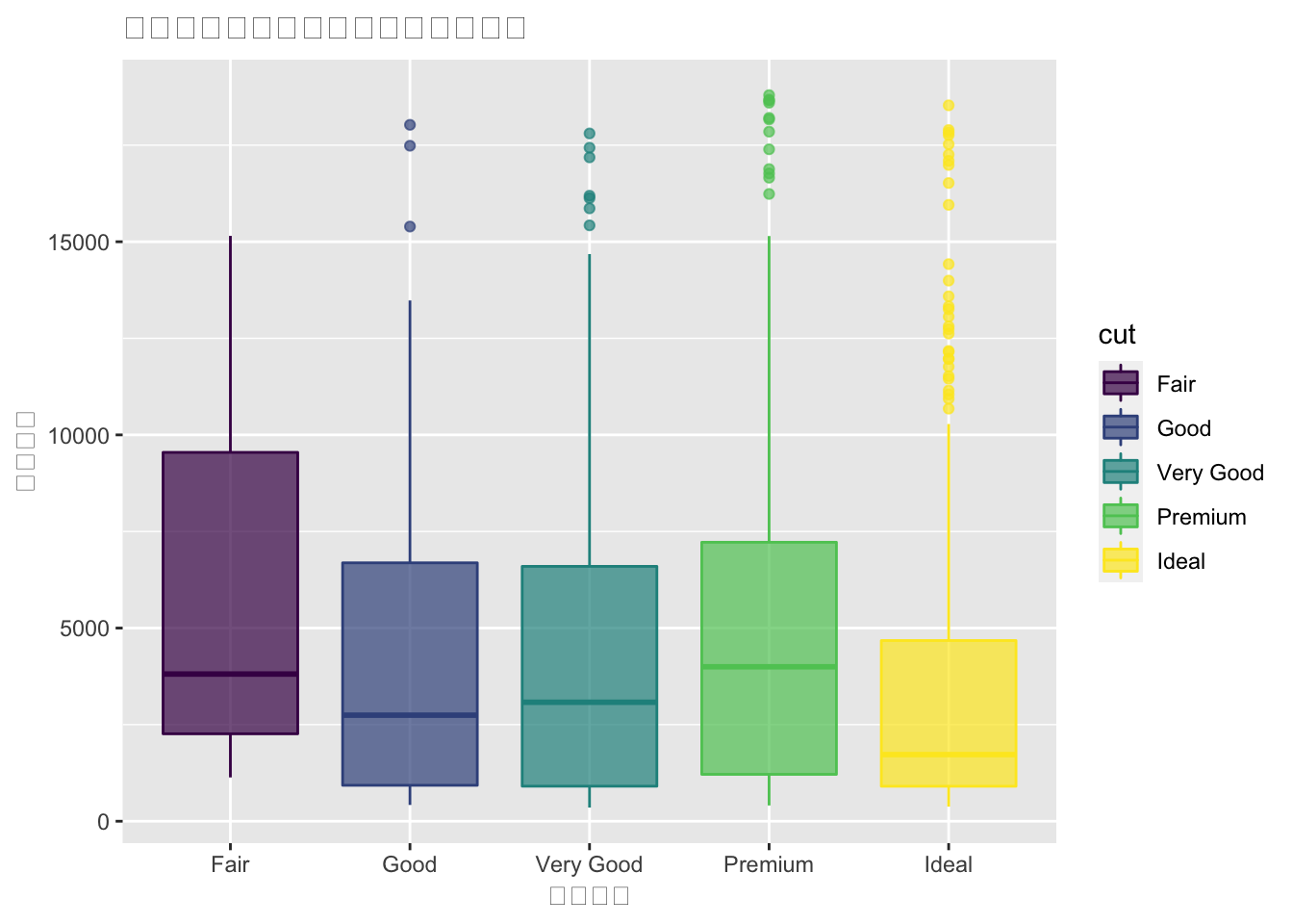 labs(x="钻石切工",y="钻石价格",title="钻石切工和钻石价格关系分布箱线图")