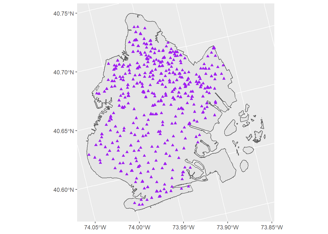 geom_sf(data = schools, shape = 17, color = 'purple')