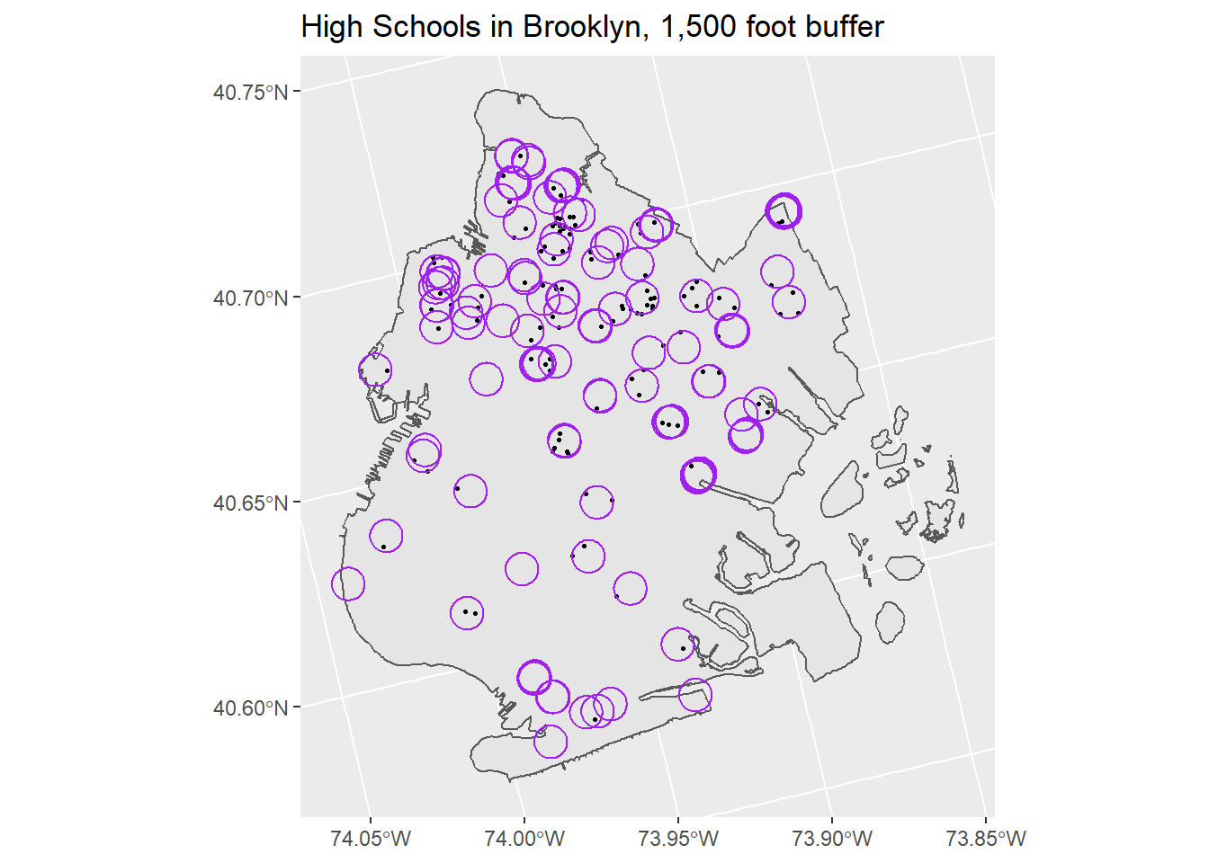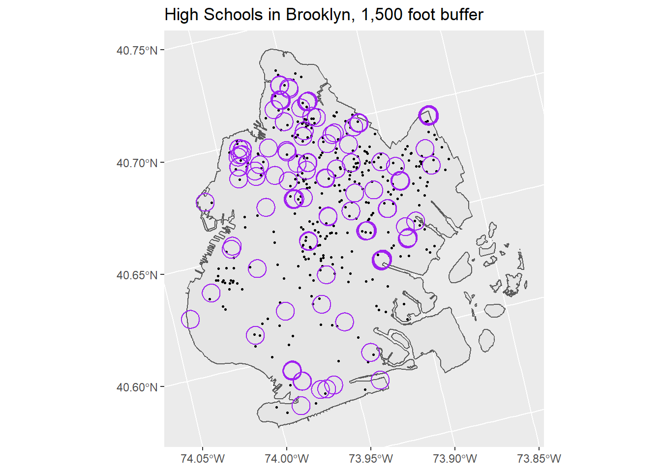 labs(title = "High Schools in Brooklyn, 1,500 foot buffer")