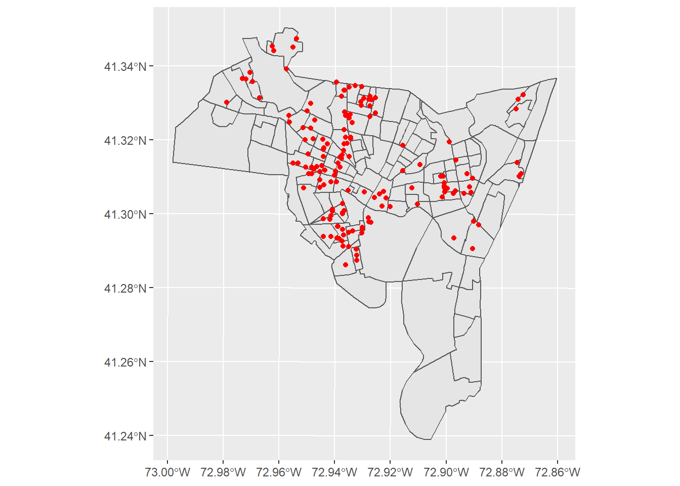 cluster_points(homicide, new_haven, pts = 5, dist = 1000)## DBSCAN clustering for 161 objects.
