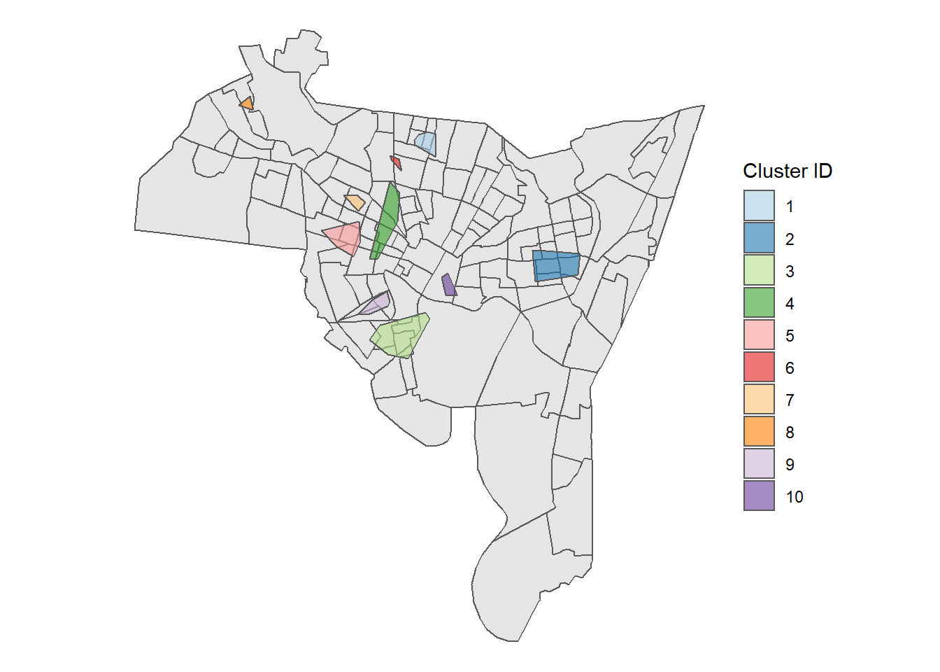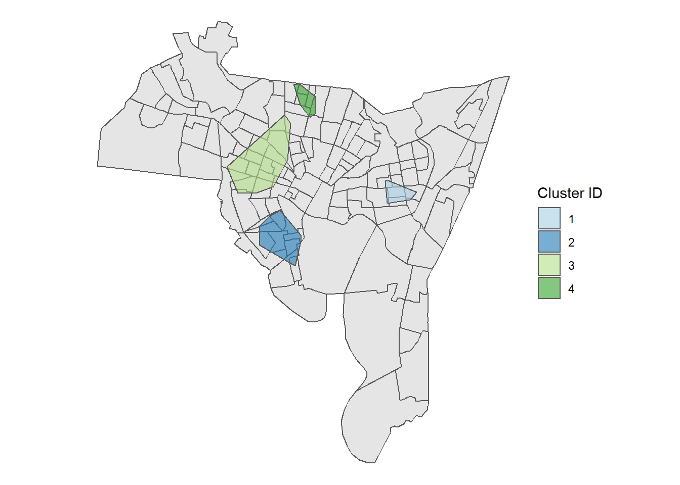 So, based on the output we have 4 total clusters. Cluster 1 and 4 are relatively small, while clusters 2 and 3 are much larger. Cluster 3 in particular has 40 homicides, which is about 25% of all homicides in New Haven. Given our limited resources, we might focus on the neighborhood around Cluster 3.