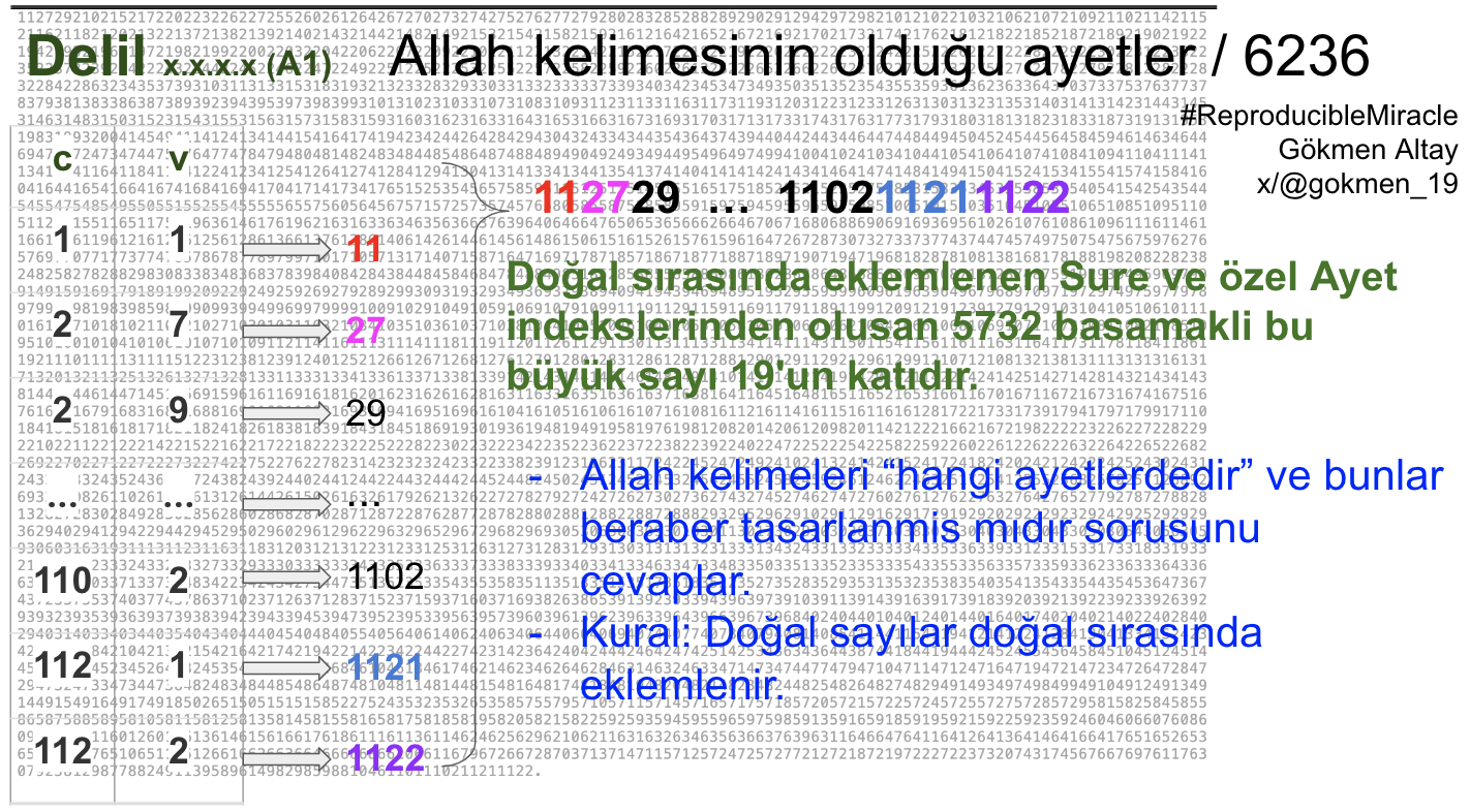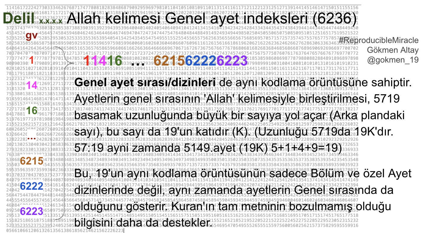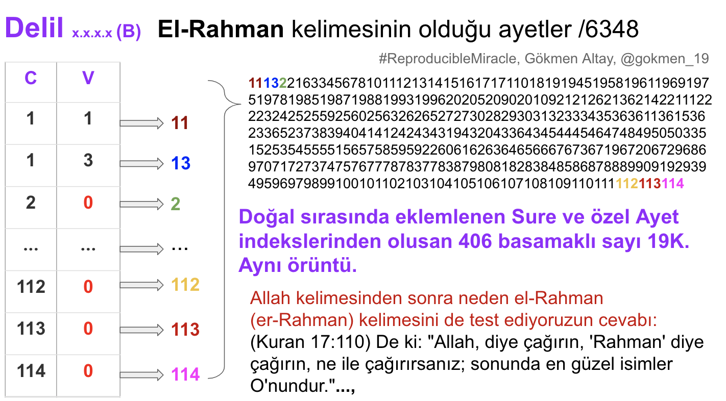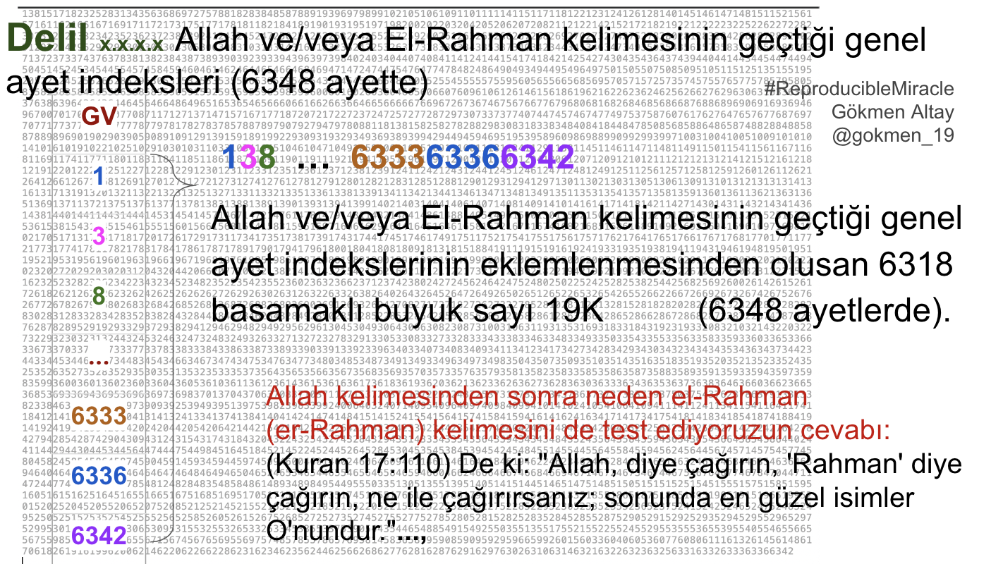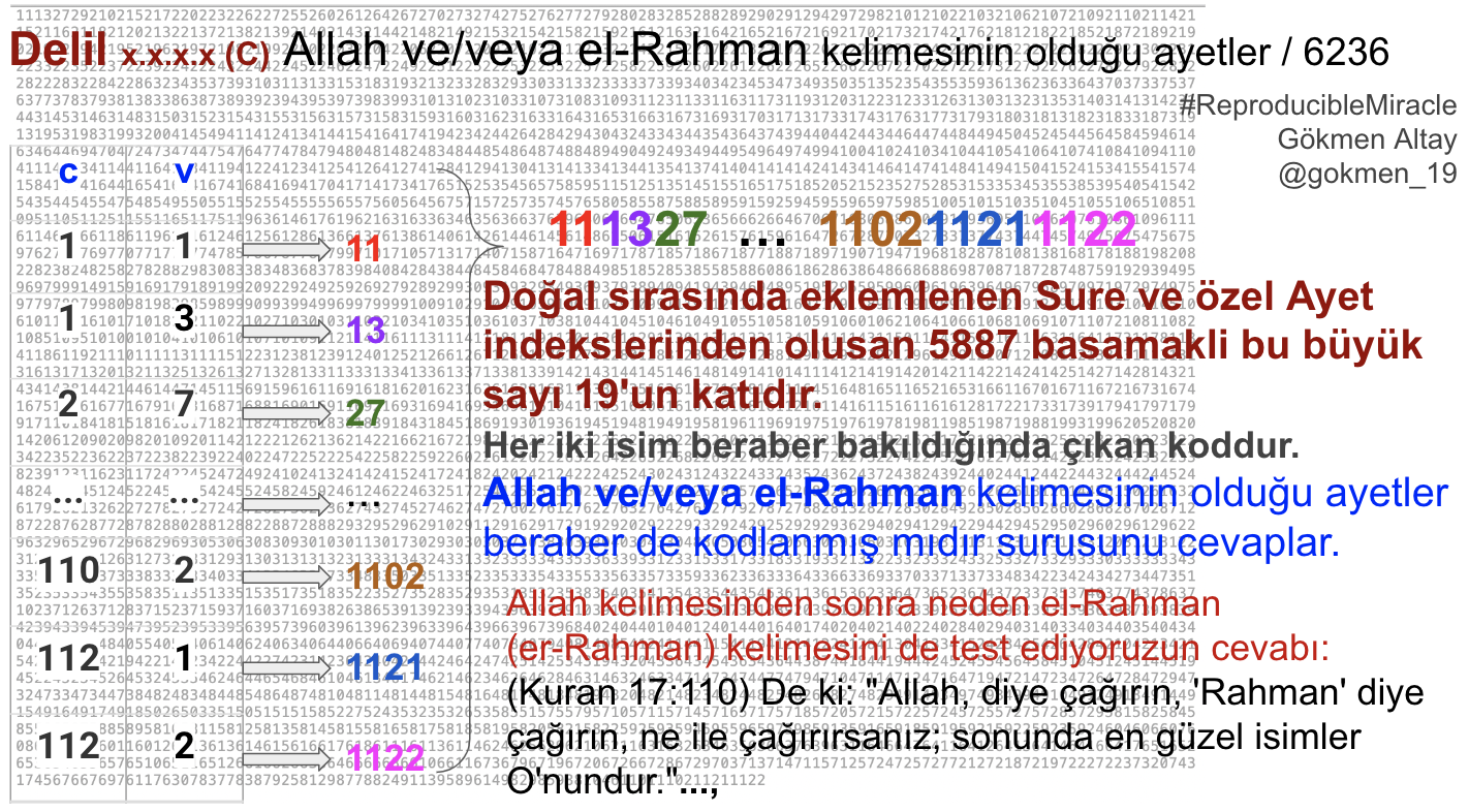 Bu nedenle, bu bölümün alt bölümlerinde, 5.1 Delilinde, Kuran’ın tüm ayetlerinde Allah ve El-Rahman kelimelerinin pozisyonlarının ve sayılarının ayrı ayrı ve aynı kodlama örüntüsüyle birlikte 19 tabanlı bir tasarım altında olduğunu gösteren delilleri sunacağım.
