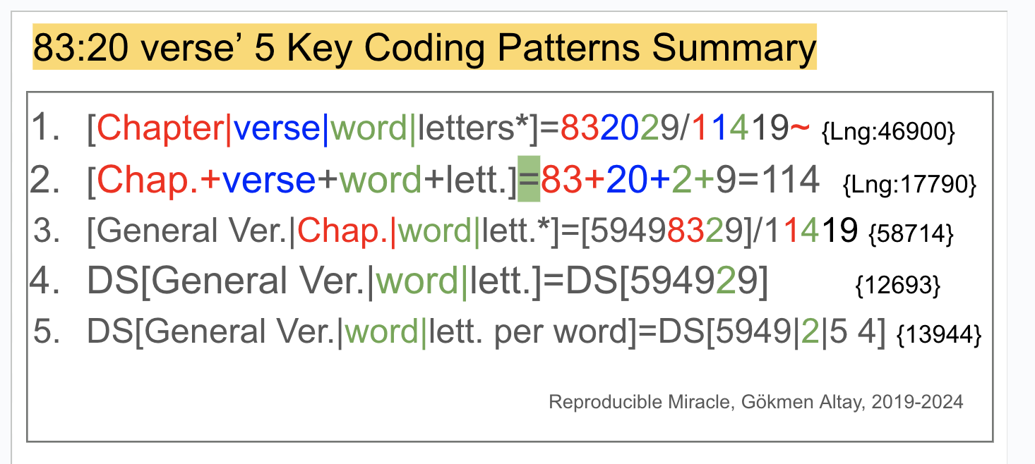 Also, when we consider this observed coding in this verse as a key coding pattern, then we would expect it to exist over the full text of Quran too. In fact, we observed it in Evidence 4.2.7, where we use the exact same key coding pattern and rewrite the full text of Quran and the resulting big coding number is also multiple of 19. Moreover, I already presented in the chapter of Evidence 4.2.7 that the sum of the number of chapters, verses, words and letters is 417544 and it was used as the key coding pattern of Evidence 4.2.7. The same key coding pattern also observed in the verse 83:20 as I just presented. This fact further supports this key coding pattern and make it more important key coding pattern that exist over the full text of Quran.