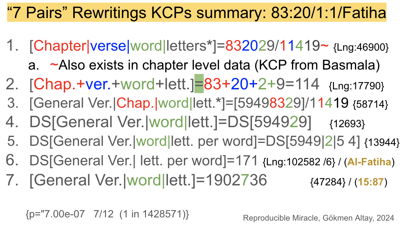 For these numbers combinations, as mentioned before, I looked at few places to find the key coding patterns. I mentioned them before but to remind, the main places are, the first chapter Al-Fatiha, the first verse Basmala, the special verse 83:20 with strong meaningful connection to the 19 Coding System.