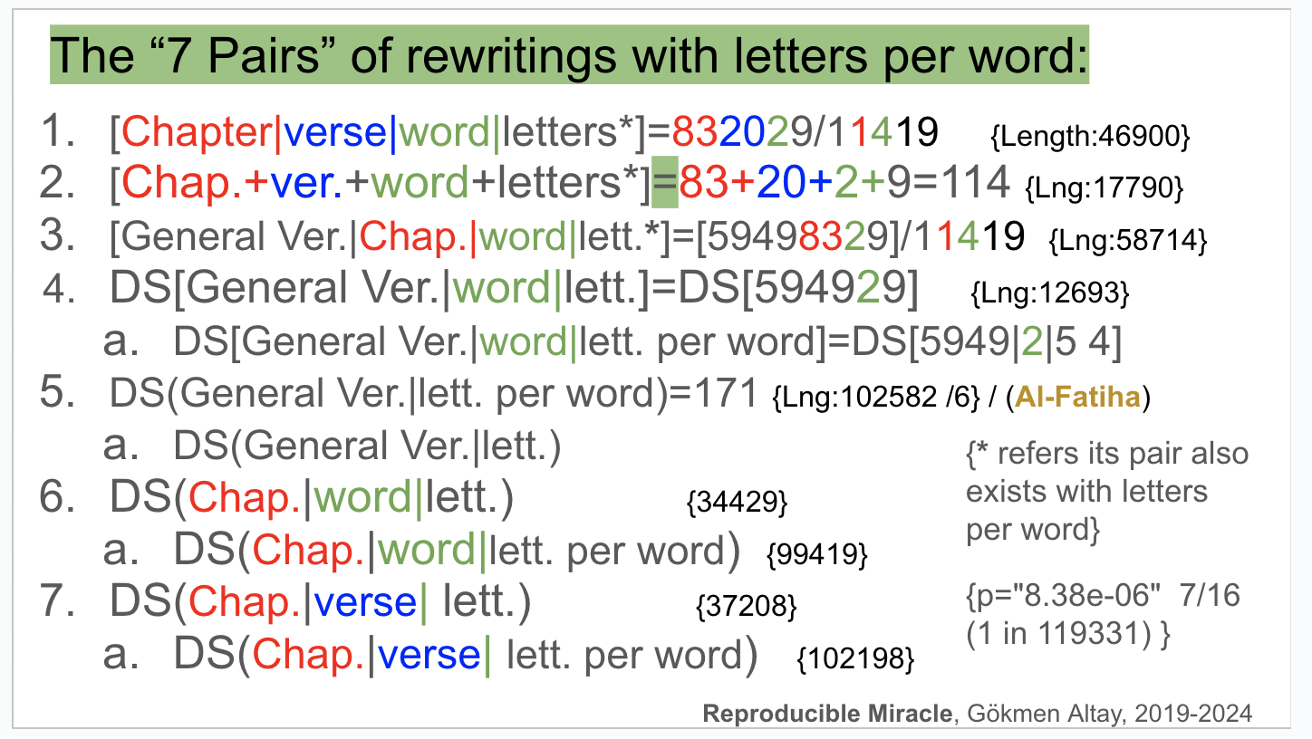 The chapter, verse and words information are considered universal: Since this particular subchapter provides the Al-Fatiha based 19 system of the full text of Quran, Al-Fatiha based 19 system should have been readily available to be discovered at all times since Quran was revealed in its completeness since 632. Although I used the common Hafs manuscript text that represents Quran, there might still be various versions of Hafs manuscripts considering various slight differences in writing of some of its words because of varying writing styles. Namely, they are the same words but they might have slight differences in letters while writing the same word during the history. See the details on this matter in Chapter 3.1 and Chapter 3.2.1. The Al-Fatiha based 19 system of the text of Quran presented in this particular subchapter Chapter 4.1.2 does not include the letters information and therefore represents almost all of the Hafs manuscripts. Namely, the evidences of the Al-Fatiha based 19 system should incorporate information that verifies the exact structure and content of the text of Quran in most of the Hafs manuscripts of the current and past time. Since the main sounding narrative about the preservation of Quran is such that “it has been protected till the last word of it”, the three text elements of the text, chapter, verse and words, is universally required in any code that claims to stand as an evidence for the protection of Quran along with its content and structure at some level. These three content information of the text together are the bare minimum to represent the full text with its structure and content information. As mentioned before, there might be some variations in writing some of the words with slight differences in writing of the same words but they all mean the exact same word. In English, we can give an example of the word “color” and “colour” for the same word written with different letters. Therefore, I consider the codes without the letters information as the most universal as it covers almost all of the Hafs manuscripts and independent from the slight letters differences.