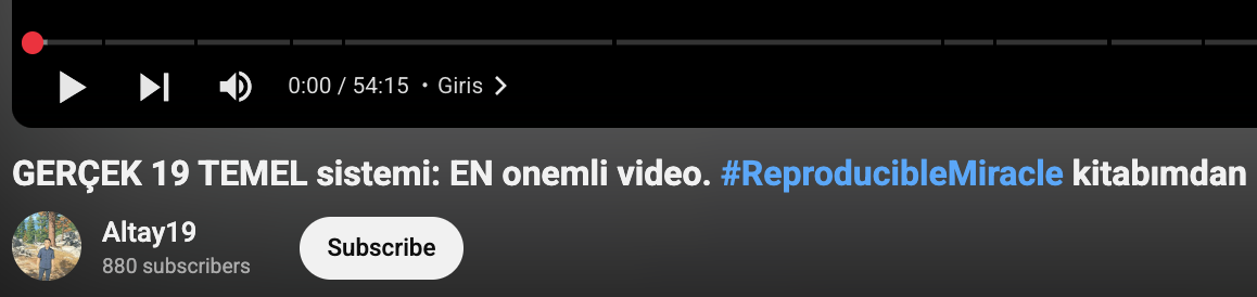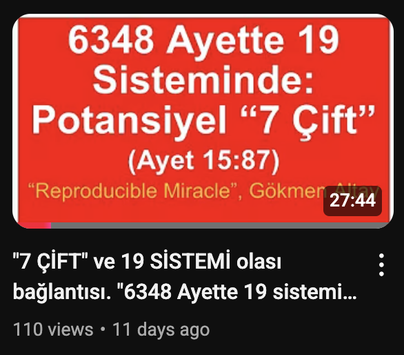 I have explained my subjective experience about the “7 Pairs” in the previous chapter, Chapter 4.2.15.1. I had one more similar experience in one of my earliest videos, which I had published in 2020 in this link: https://www.youtube.com/watch?v=N20oo72SOaY with the title, in Turkish, “GERÇEK 19 TEMEL sistemi: EN onemli video. #ReproducibleMiracle kitabımdan”. The title translates in English as “The REAL 19 system: THE MOST important video. From my book #ReproducibleMiracle”. It is also a raw video that I published without any editing. It was the most important video I had published as I was explaining the most important part of the 19 System presented in my book. I still consider that part of the 19 System, which is the 19 System part that is based on key coding patterns (KCP) from the first and arguably the most important chapter al-Fatiha. I still consider that part of the 19 System as the main 19 System part presented in my book. It also does not include any letters information and thus should exist in almost all the Hafs manuscripts and thus maybe the most universal system part presented in my book. So, my first subjective experience considering the video time was based on that video in 2020. However, I did not widely share until now (Jul 26, 2025) and preferred too keep it personal. Because, the probability of that experience had not seem as strong as I witnessed about the “7 Pair” video. However, that personal experience was still supportive and motivating to me personally in my studies. I will not go into those detailed events here. Let me now summarize the experience about the al-Fatiha based 19 System video as far as I recall.
