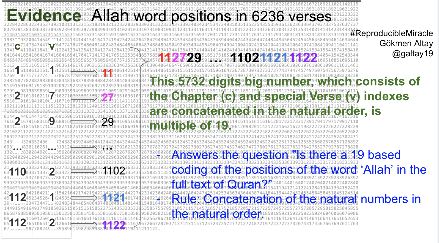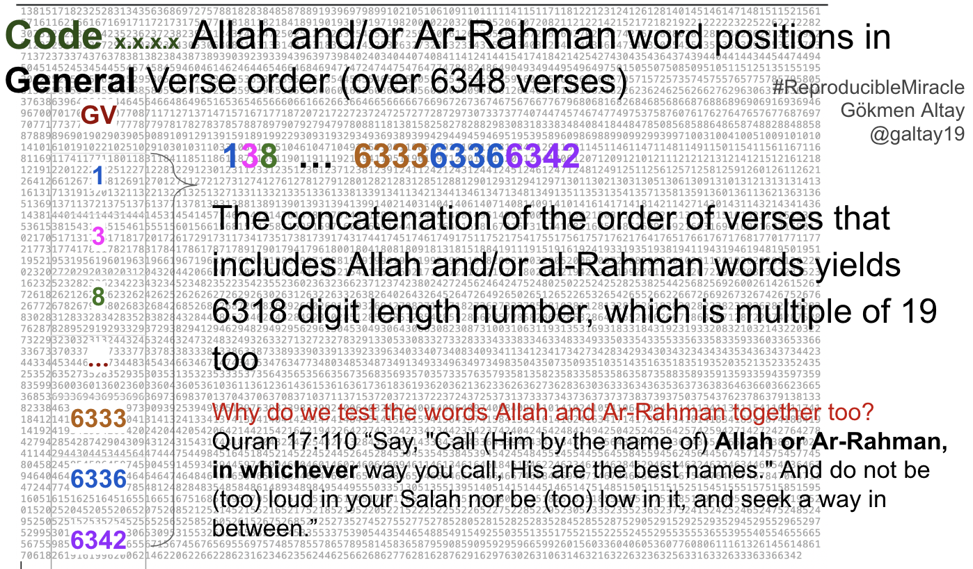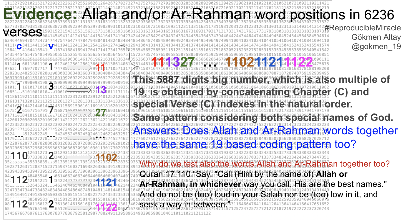 Therefore, in the sub-chapters of this chapter, in Evidence 5.1, I will provide the evidences that show the positions and counts of Allah and Al-Rahman words over all the verses of Quran are under 19 based design individually and also together with the same coding pattern.