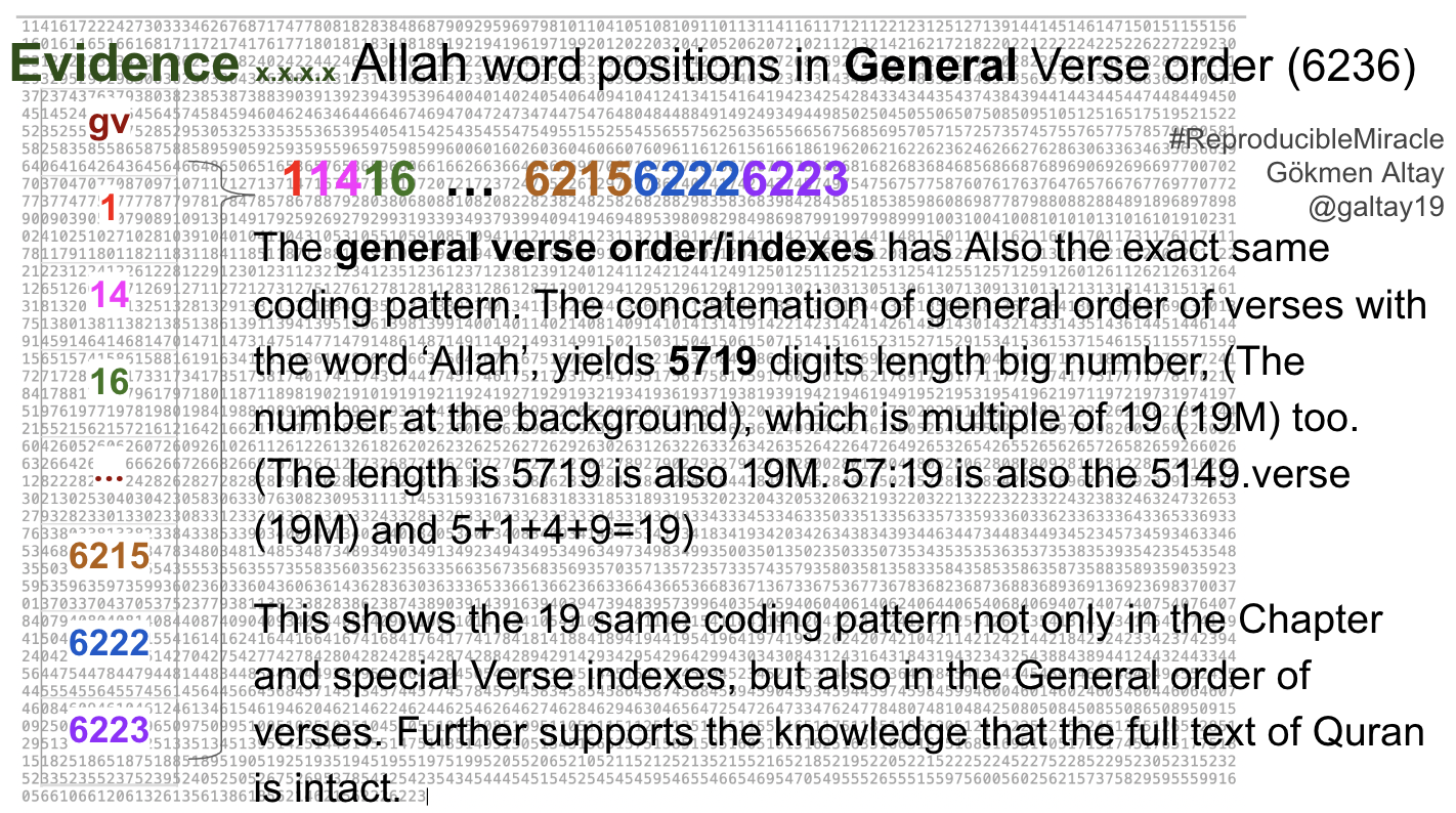 As two further facts, if we had used general verse indexes, from 1 to 6348, instead of the normal indexes like chapter and special verse indexes, then the same exact coding pattern of this section results 31404 digit length big number whose digit sum is 125248 that is multiple of 19 too. Namely, whether we use the normal chapter and special verse indexes together or the general verse indexes alone, in both cases, the same coding pattern yield a number which is multiple of 19. However, since I do not use the general verse indexes in the coding of Ha-Mim, following the rules, I do not count it as another code of evidences. Since this is additional to the normal coding pattern, it is interesting and I inform this further fact here. There is one more further fact on this coding pattern with the general verse index. The exact same coding pattern with the general verse index also exist if we look at only those 7 special chapters, which results 2103 digits length number, 8265, that is also multiple of 19. Chapters 40 to 46 are special for Ha-Mim letters as Ha-Mim letters appears as independent verses in them, which had led as to look at it over the full text of Quran as the sum of them in those 7 chapters is multiple of 19.