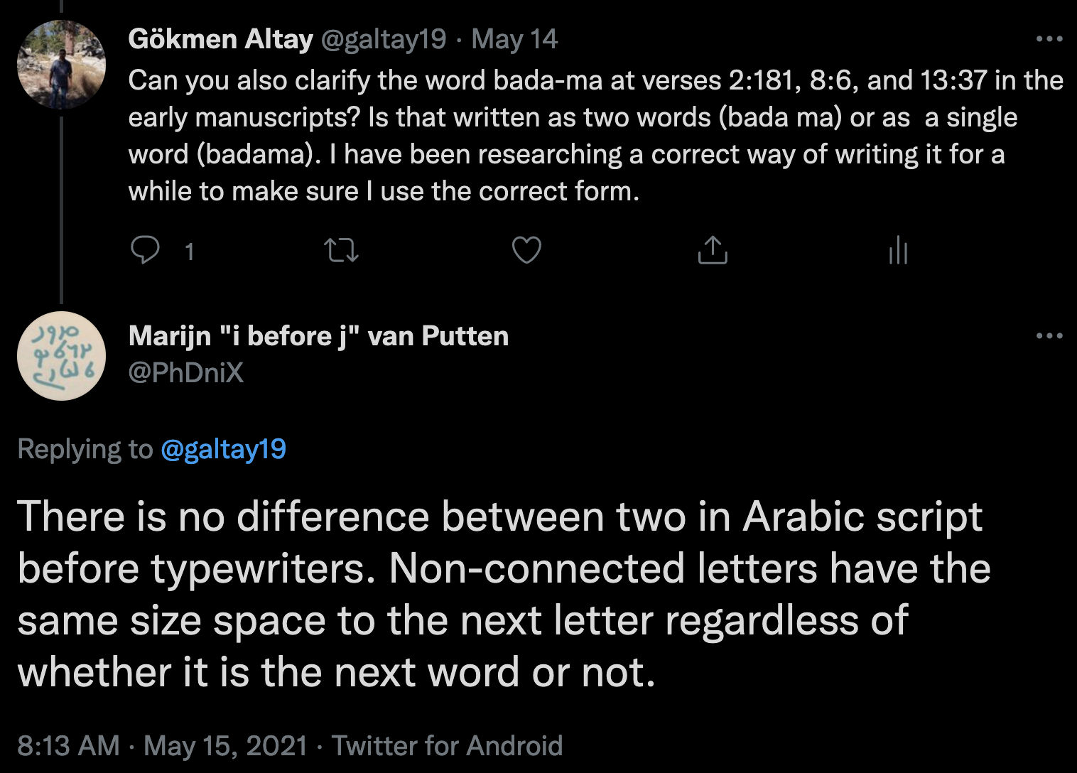 I searched experts from all over the world via internet and tried to reach all the academics with expertise in Arabic language that I could find. A small portion of them kindly returned to my question with an answer about whether the word ba’da-ma is one word or two words in the three verses with respect to classic Arabic grammar. Unfortunately, the replies were mixed, which left me with an unsatisfactory feeling as neither my mind nor my heart was fully convinced that I found the truth from the replies I received. It is worth summarizing the replies I received as this process lasted for a significant time from about February 2021 till October 2021.