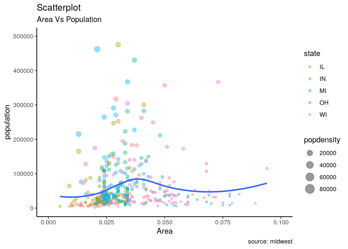 geom_point(alpha = 0.4, mapping = aes(color = state, size = popdensity)) +