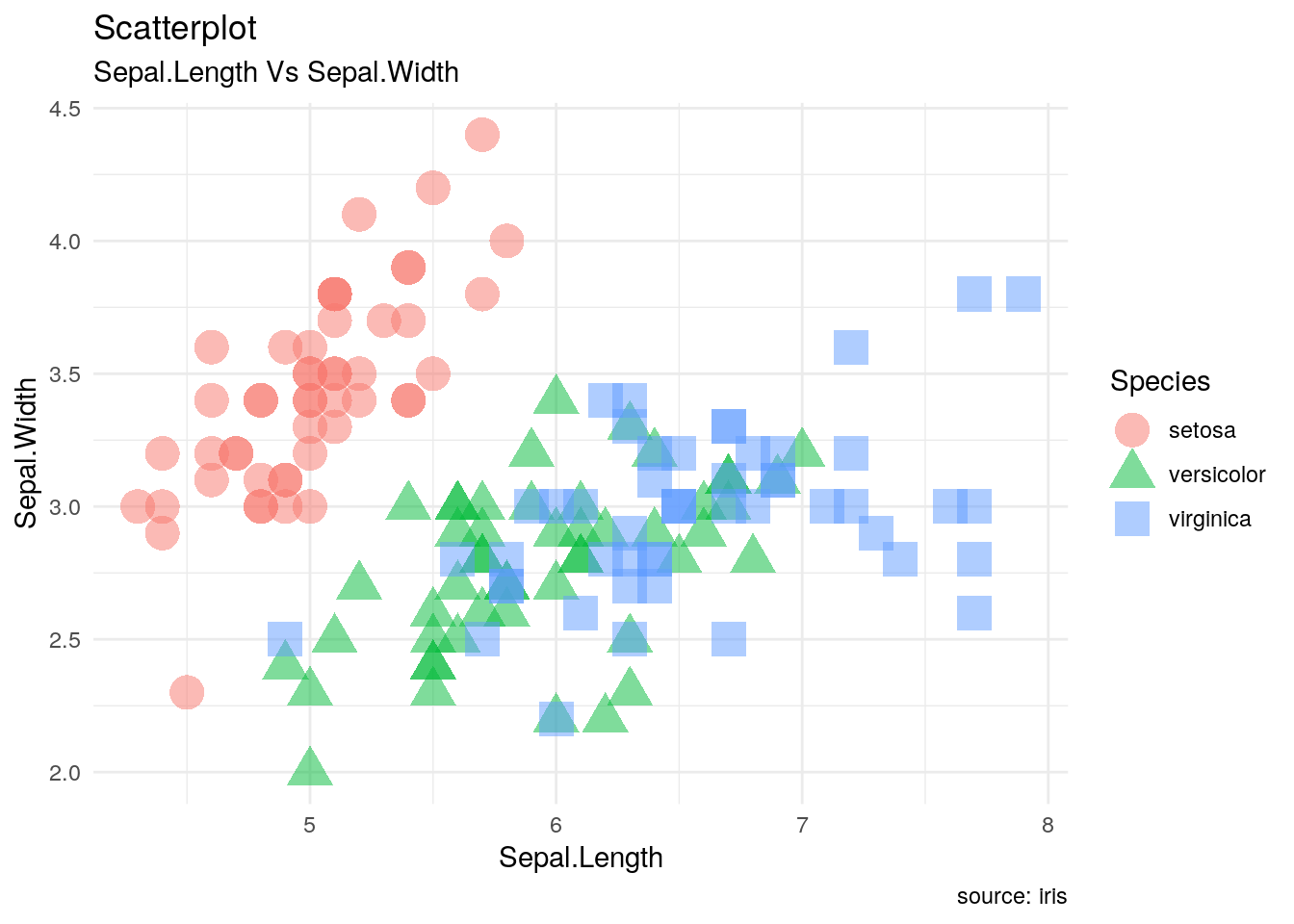 ggplot(data = iris, aes(x = Sepal.Length, y = Sepal.Width, color = Species, shape = Species)) +