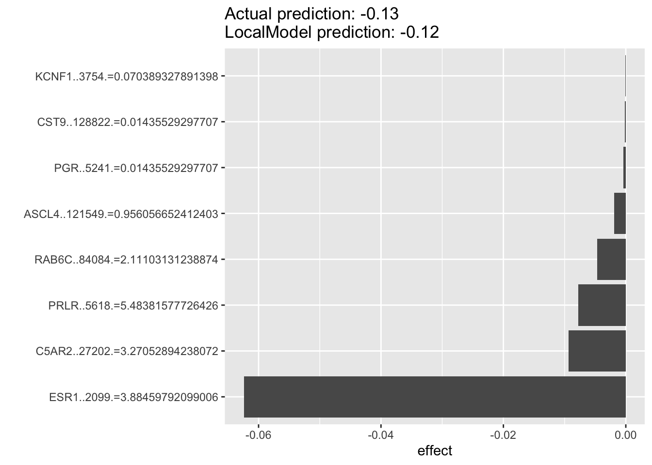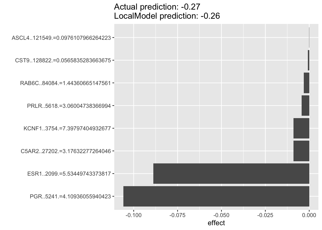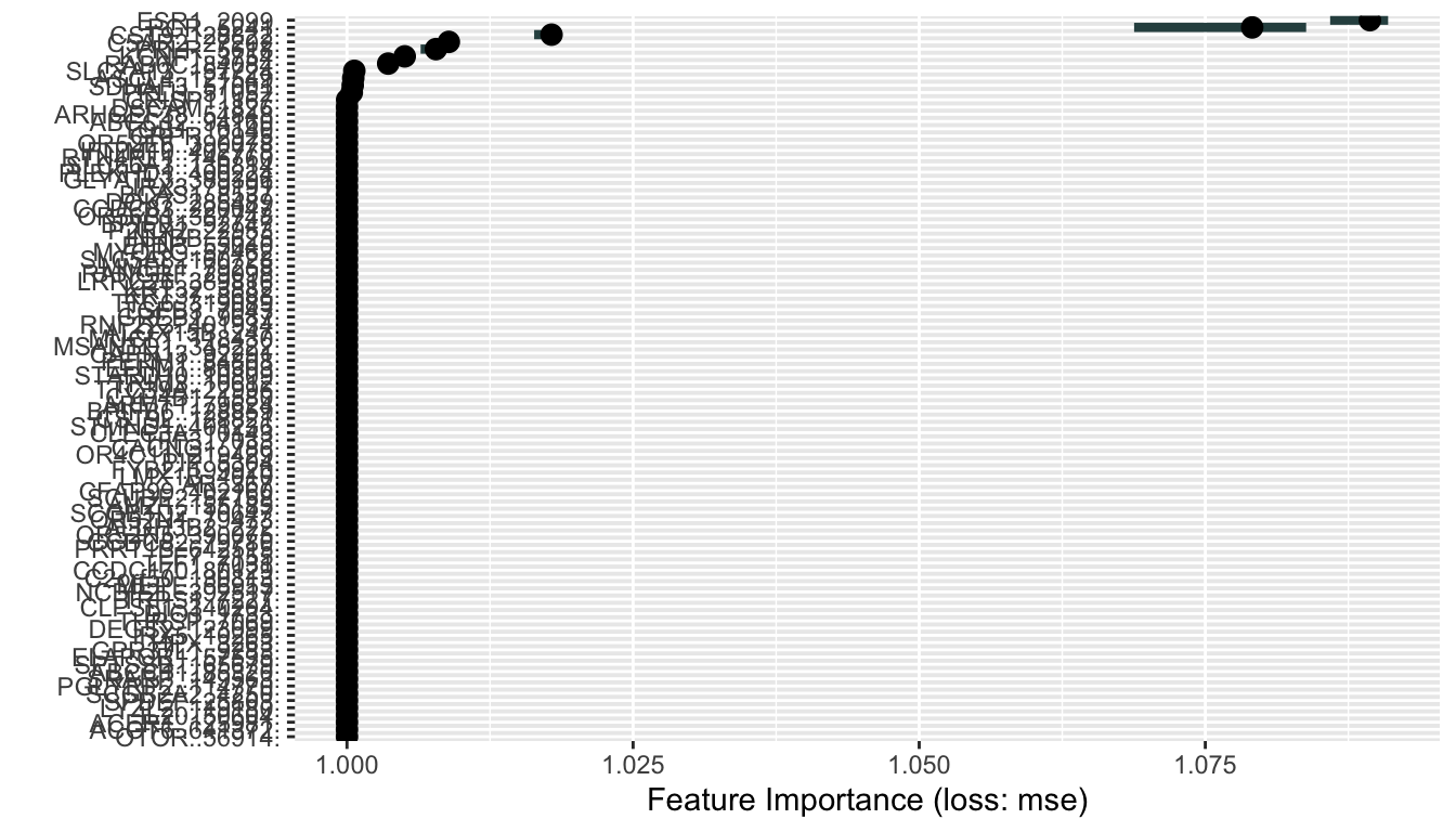 We can see that PGR and ESR1 expressions are the top predictors for ESR1 dependencies.