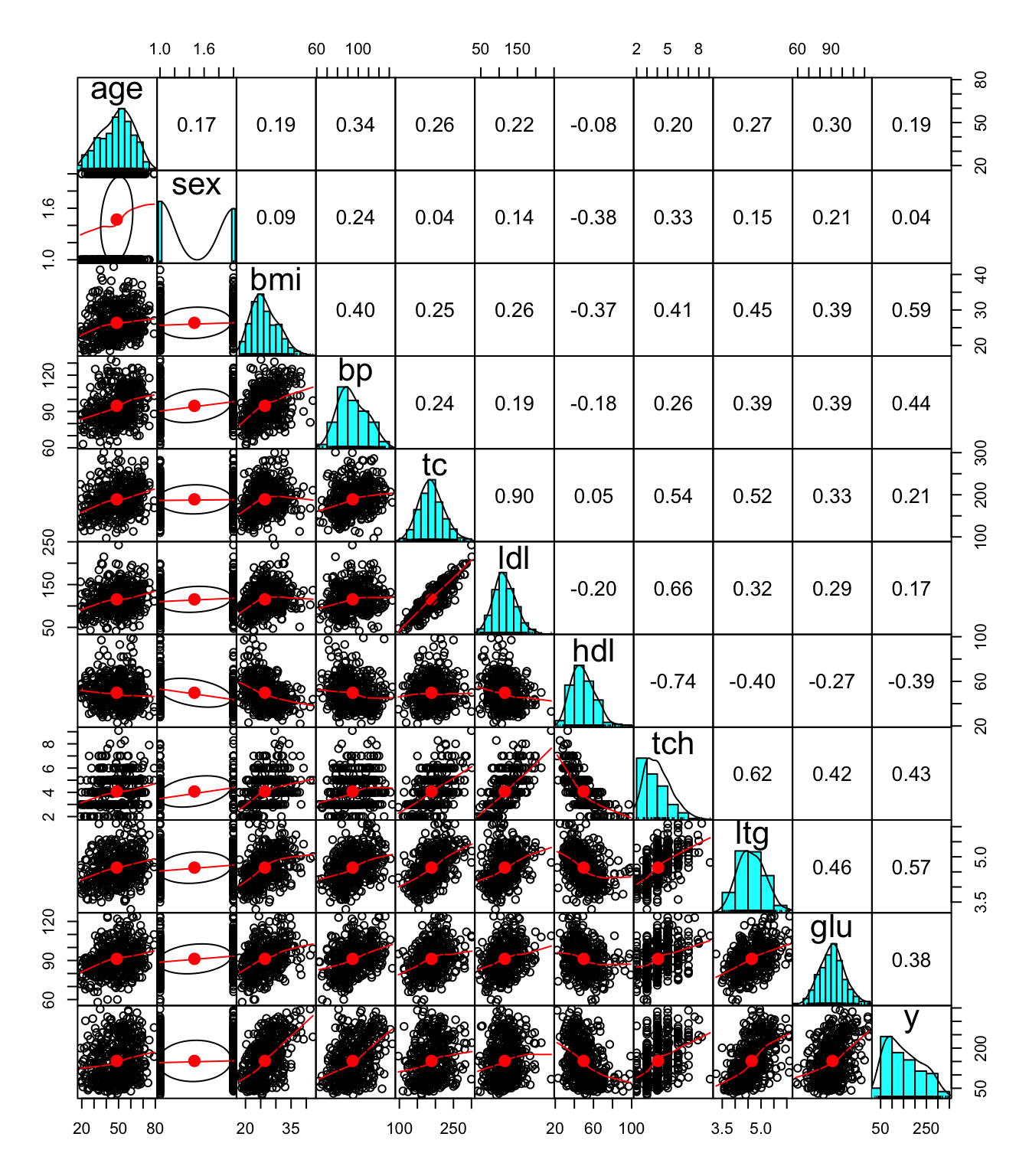 The variables are named: - age sex bmi map tc ldl hdl tch ltg glu y