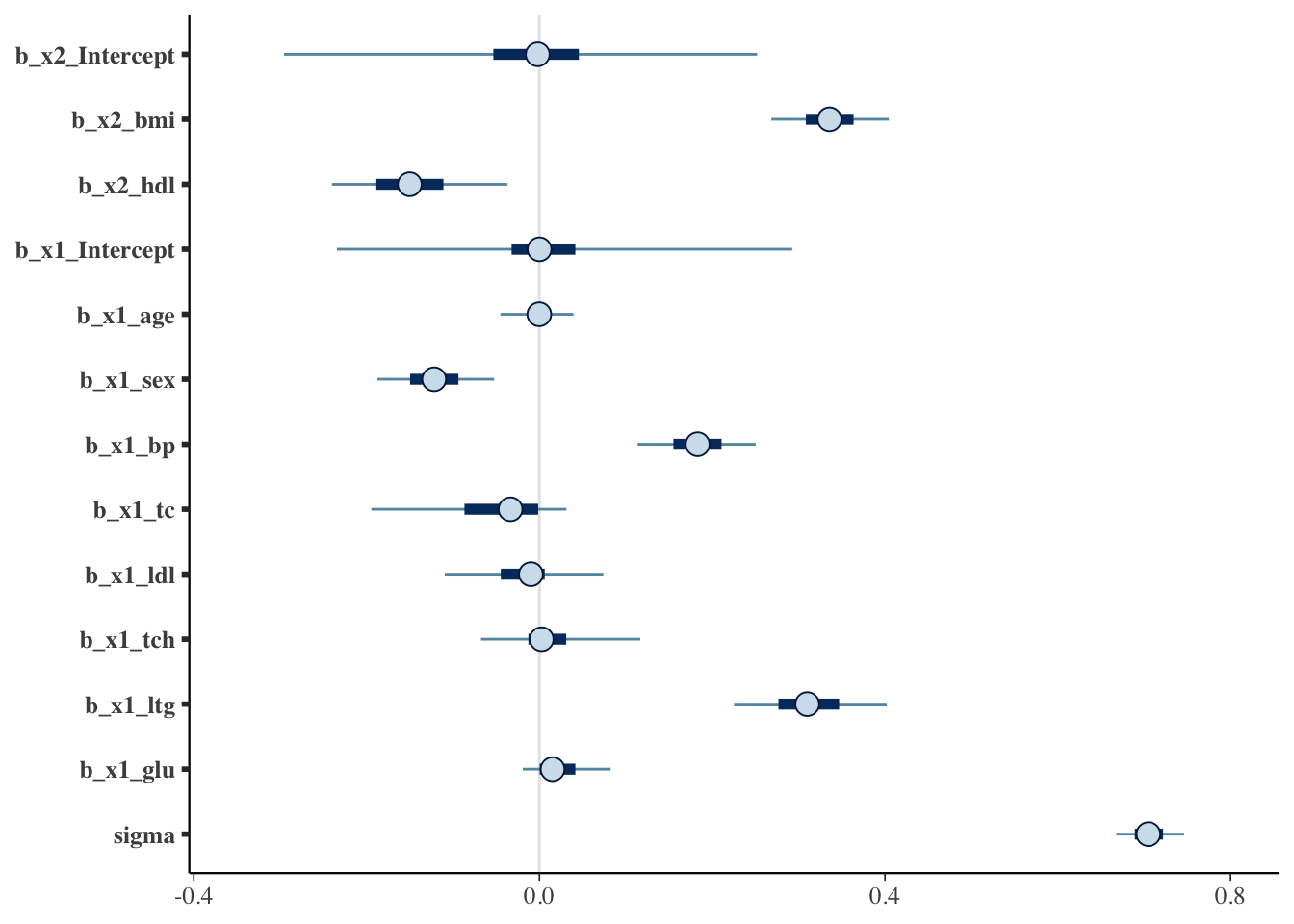 If the 95% confidence-interval of a variable is not overlapping with 0, we will consider it to be selected. So the plot below indicates that in addition to bmi and hdl (our base variables, which are not subject to horshoe prior selection), sex, bp and ltg are selected.