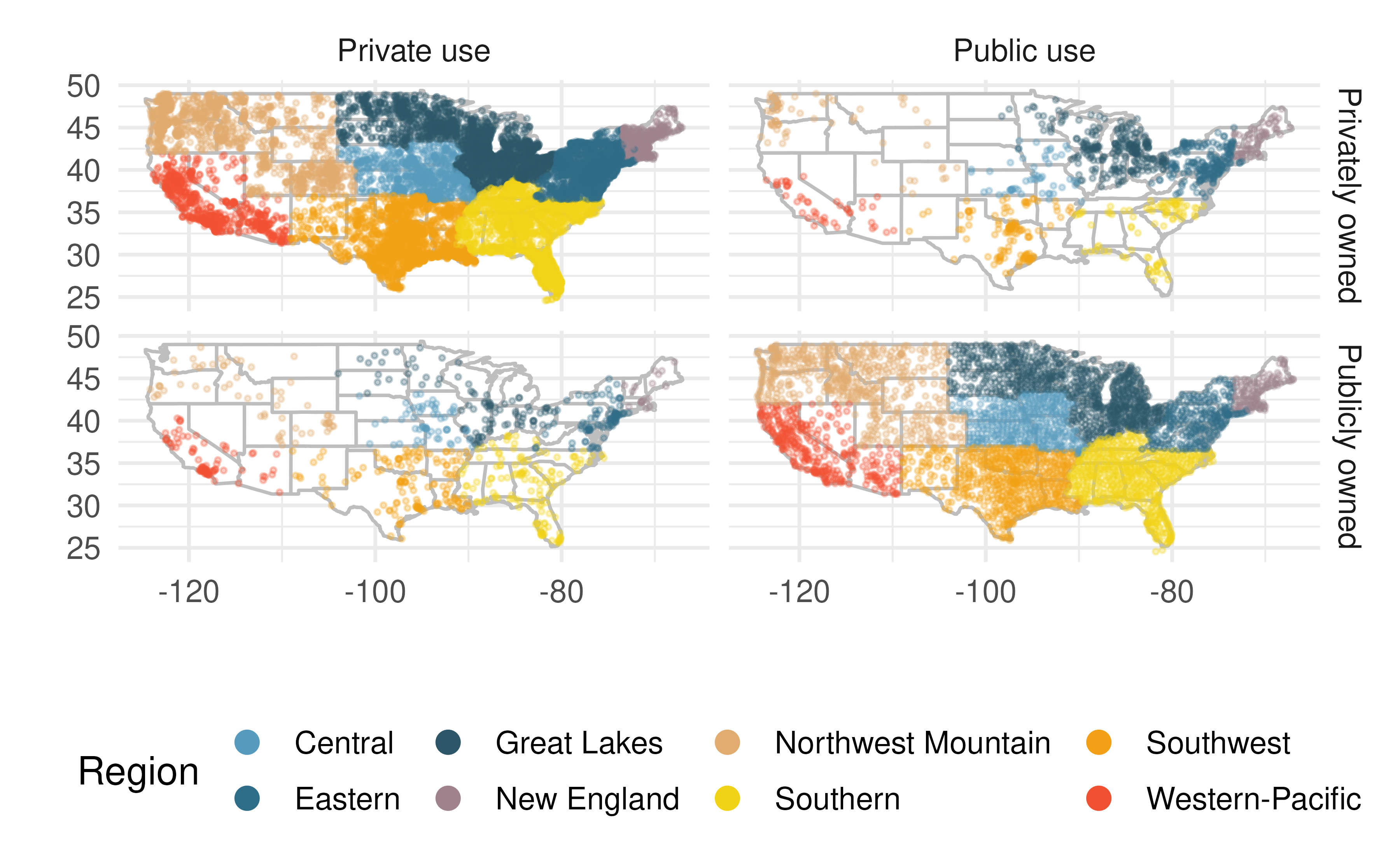 US Airports. The visualization below shows the geographical distribution of airports in the contiguous United States and Washington, DC. This visualization was constructed based on a dataset where each observation is an airport.19