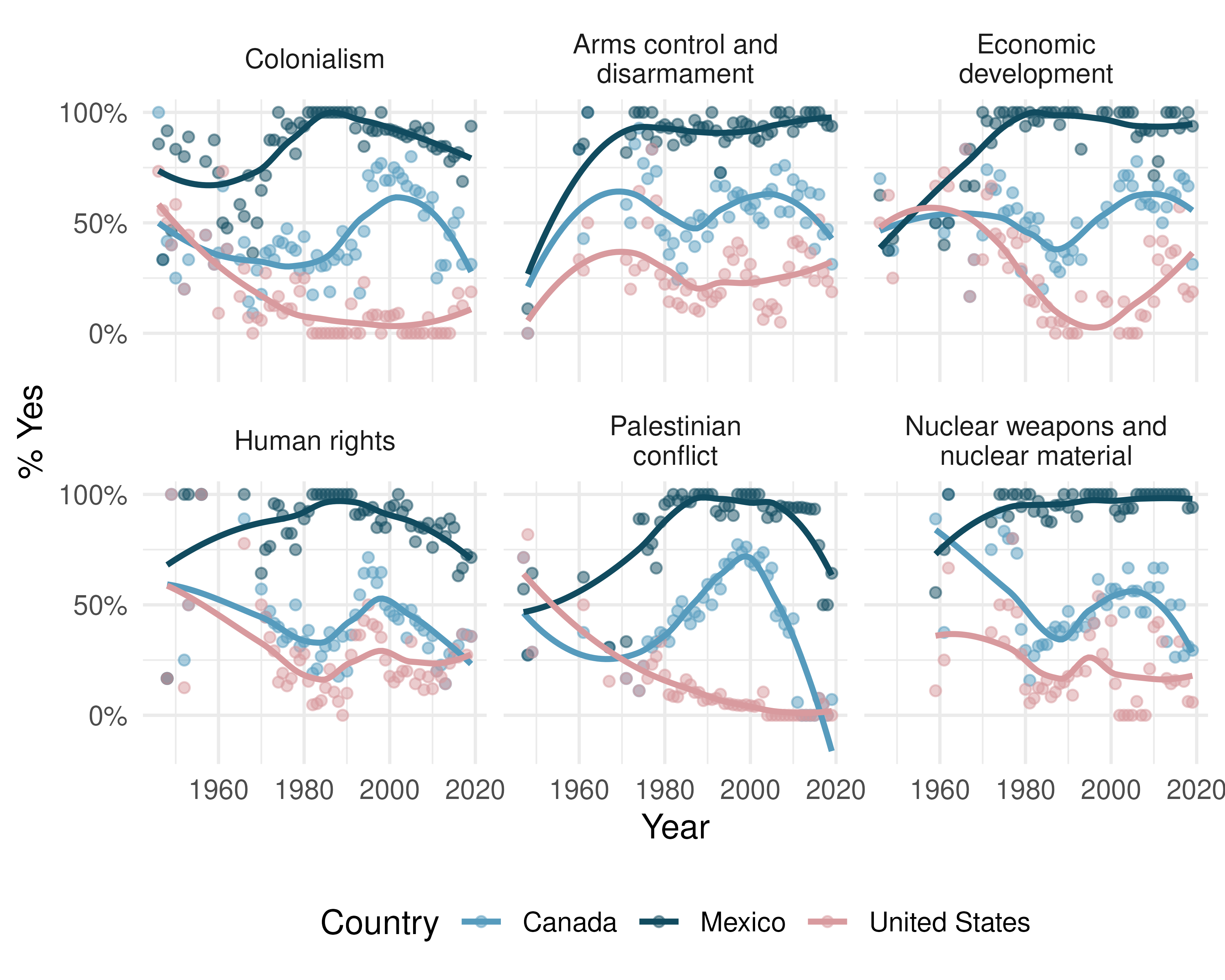 UN Votes. The visualization below shows voting patterns in the United States, Canada, and Mexico in the United Nations General Assembly on a variety of issues. Specifically, for a given year between 1946 and 2019, it displays the percentage of roll calls in which the country voted yes for each issue. This visualization was constructed based on a dataset where each observation is a country/year pair.20