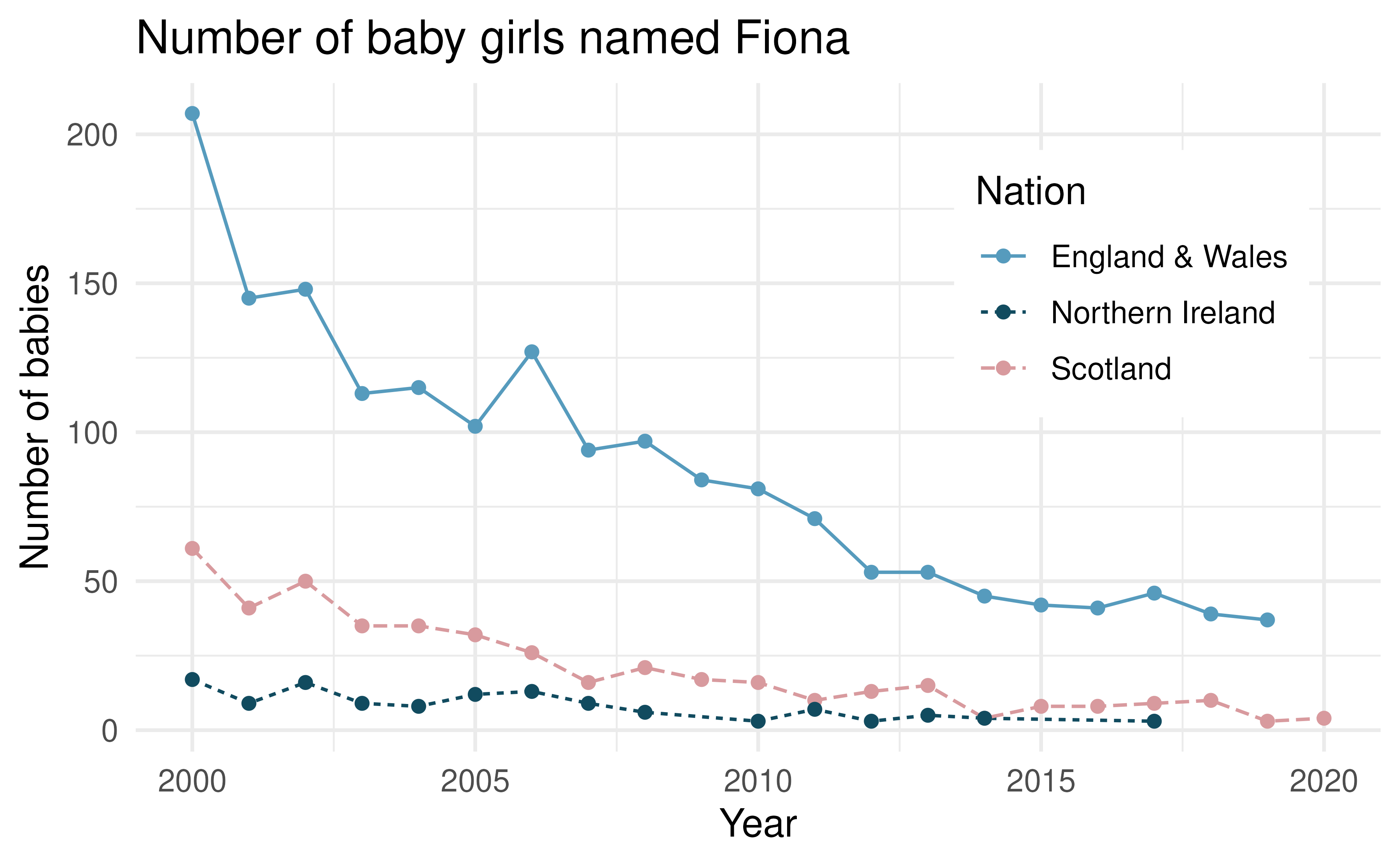 UK baby names. The visualization below shows the number of baby girls born in the United Kingdom (comprised of England & Wales, Northern Ireland, and Scotland) who were given the name “Fiona” over the years.21
